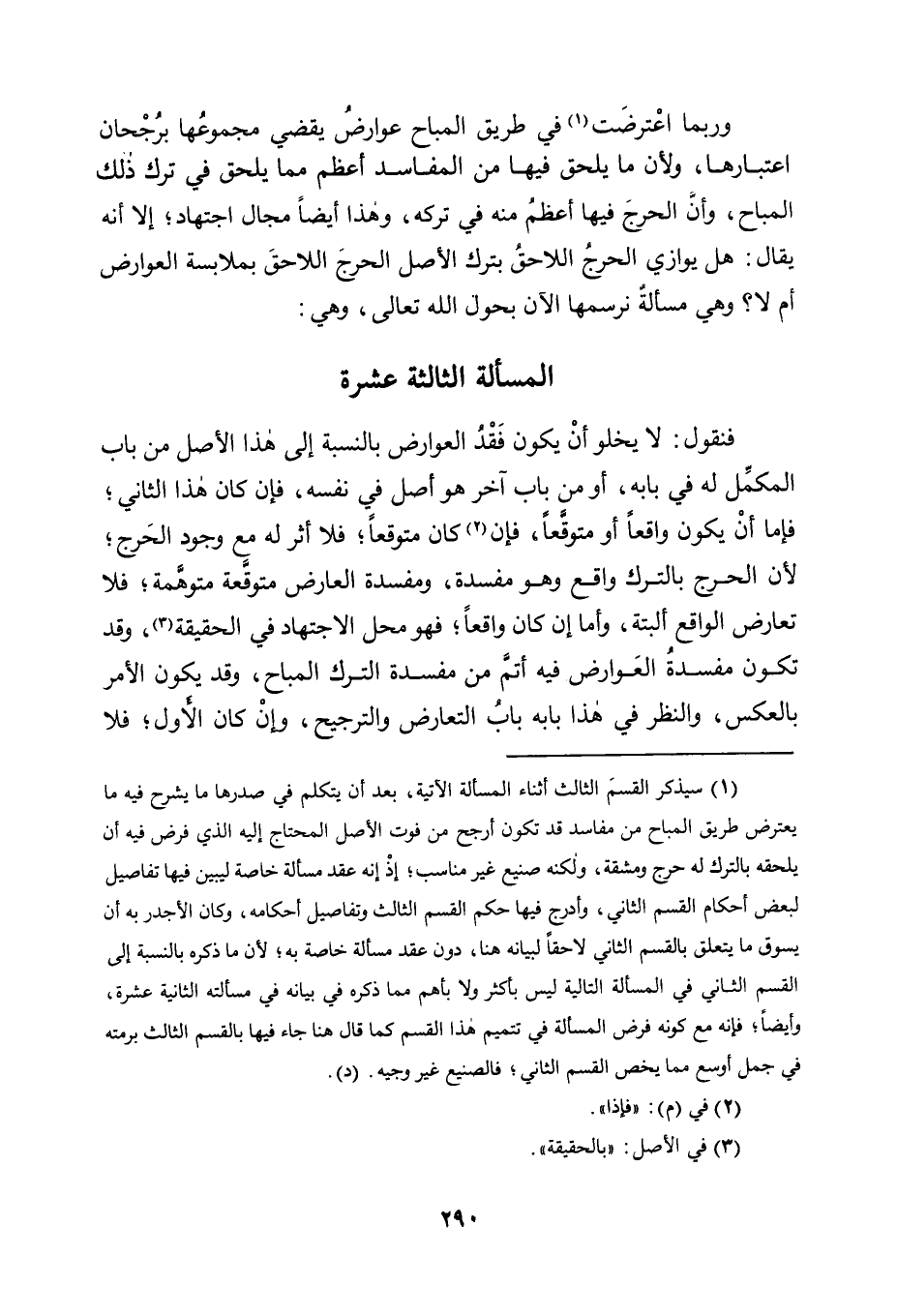 1 سيذكر القسم الثالث أثناء المسألة الآتية، بعد أن يتكلم في صدرها ما يشرح فيه ما يعترض طريق المباح من مفاسد, قد تكون أرجح من فوت الأصل المحتاج إليه الذي فرض فيه أن يلحقه بالترك له حرج ومشقة، ولكنه صنيع غير مناسب؛ إذ إنه عقد مسألة خاصة ليبين فيها تفاصيل لبعض أحكام القسم الثاني، وأدرج فيها حكم القسم الثالث وتفاصيل أحكامه، وكان الأجدر به أن يسوق ما يتعلق بالقسم الثاني لاحقا لبيانه هنا، دون عقد مسألة خاصة به؛ لأن ما ذكره بالنسبة إلى القسم الثاني في المسألة التالية ليس بأكثر ولا بأهم مما ذكره في بيانه في مسألته الثانية عشرة، وأيضا؛ فإنه مع كونه فرض المسألة في تتميم هذا القسم كما قال هنا جاء فيها بالقسم الثالث برمته في جمل أوسع مما يخص القسم الثاني؛ فالصنيع غير وجيه. "د".