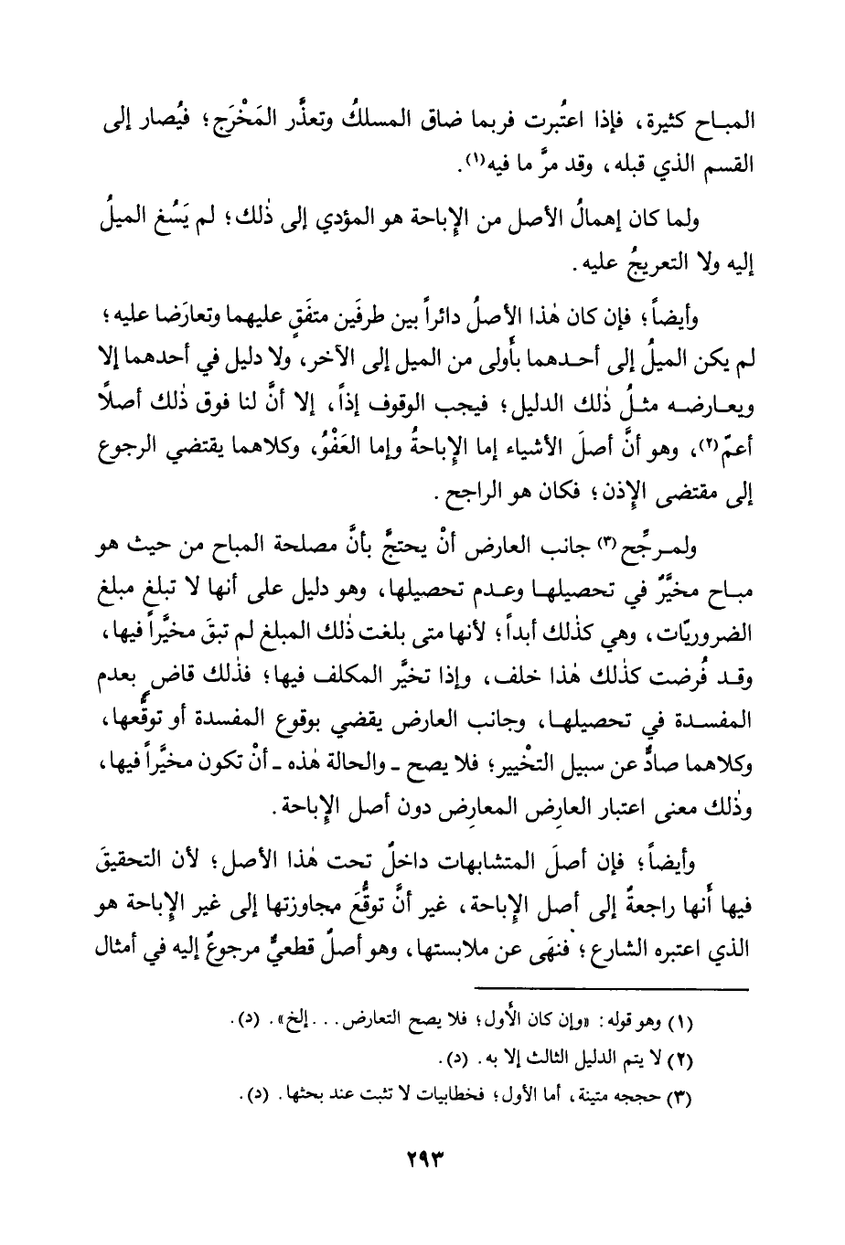 وَلِمُرَجِّحِ3 جَانِبِ الْعَارِضِ أَنْ يَحْتَجَّ بِأَنَّ مَصْلَحَةَ الْمُبَاحِ مِنْ حَيْثُ هُوَ مُبَاحٌ مُخَيَّرٌ فِي تَحْصِيلِهَا وَعَدَمِ تَحْصِيلِهَا، وَهُوَ دَلِيلٌ عَلَى أَنَّهَا لَا تَبْلُغُ مَبْلَغَ الضَّرُورِيَّاتِ، وَهِيَ كَذَلِكَ أَبَدًا؛ لِأَنَّهَا مَتَى بَلَغَتْ ذَلِكَ الْمَبْلَغَ لَمْ تَبْقَ مُخَيَّرًا فِيهَا، وَقَدْ فُرِضَتْ كَذَلِكَ هَذَا خَلْفُ، وَإِذَا تَخَيَّرَ الْمُكَلَّفُ فِيهَا؛ فَذَلِكَ قاضٍ بِعَدَمِ الْمَفْسَدَةِ فِي تَحْصِيلِهَا, وَجَانِبُ الْعَارِضِ يَقْضِي بِوُقُوعِ الْمَفْسَدَةِ أَوْ تَوَقُّعِهَا، وَكِلَاهُمَا صَادٌّ عَنْ سَبِيلِ التَّخْيِيرِ؛ فَلَا يَصِحُّ -وَالْحَالَةُ هَذِهِ- أَنْ تَكُونَ مُخَيَّرًا فِيهَا، وَذَلِكَ مَعْنَى اعْتِبَارِ الْعَارِضِ الْمُعَارِضِ دُونَ أَصْلِ الْإِبَاحَةِ.