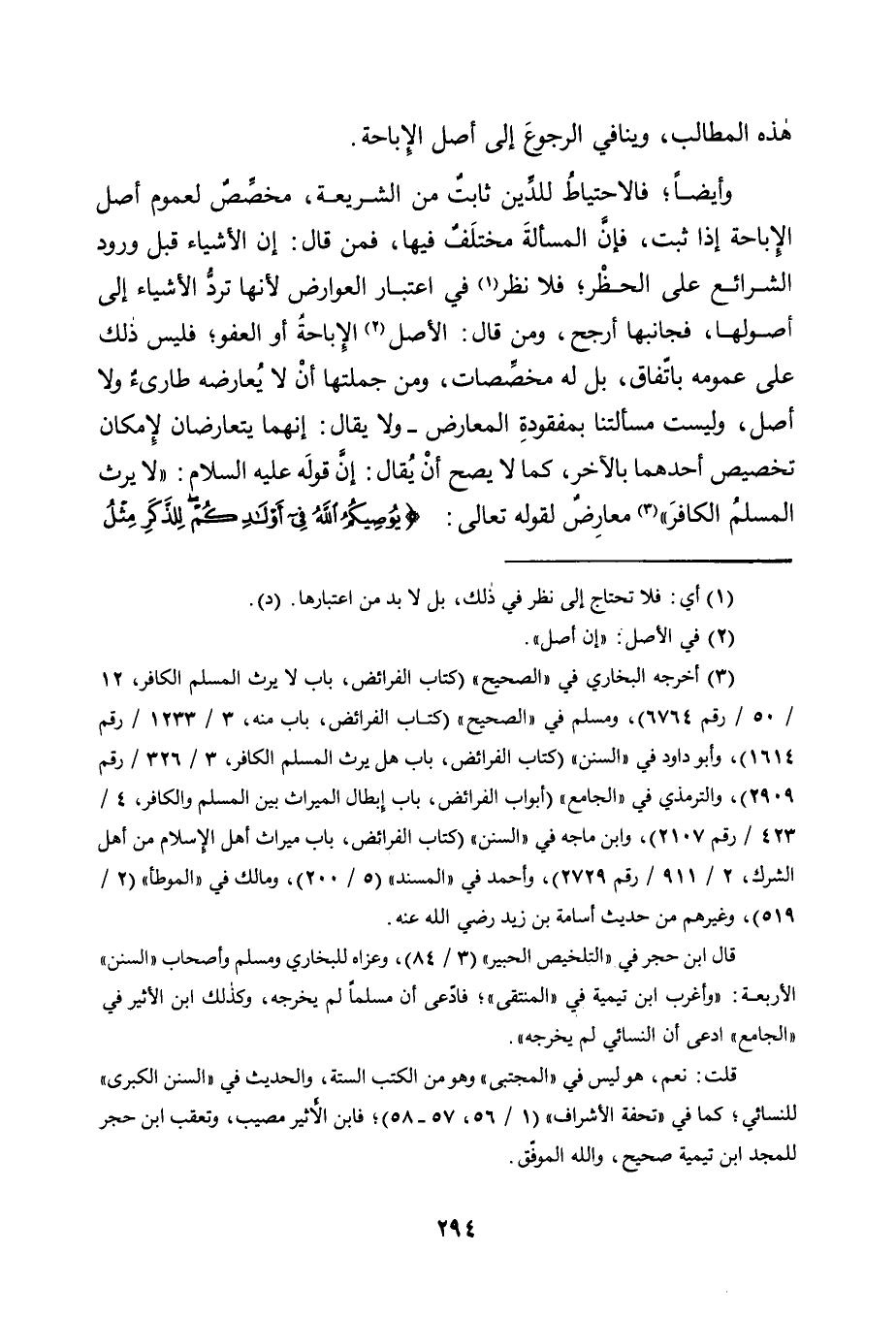 وَأَيْضًا؛ فَالِاحْتِيَاطُ لِلدِّينِ ثَابِتٌ مِنَ الشَّرِيعَةِ، مُخَصَّصٌ لِعُمُومِ أَصْلِ الْإِبَاحَةِ إِذَا ثَبَتَ، فَإِنَّ الْمَسْأَلَةَ مُخْتَلَفٌ فِيهَا, فَمَنْ قَالَ: إِنَّ الْأَشْيَاءَ قَبْلَ وُرُودِ الشَّرَائِعِ عَلَى الْحَظْرِ؛ فَلَا نَظَرَ1 فِي اعْتِبَارِ الْعَوَارِضِ؛ لِأَنَّهَا تَرُدُّ الْأَشْيَاءَ إِلَى أُصُولِهَا، فَجَانِبُهَا أَرْجَحُ، وَمَنْ قَالَ: الْأَصْلُ2 الْإِبَاحَةُ أَوِ الْعَفْوُ؛ فَلَيْسَ ذَلِكَ عَلَى عُمُومِهِ بِاتِّفَاقٍ، بَلْ لَهُ مُخَصِّصَاتٌ، وَمِنْ جُمْلَتِهَا أَنْ لَا يُعَارِضَهُ طَارِئٌ وَلَا أَصْلٌ، وَلَيْسَتْ مَسْأَلَتُنَا بِمَفْقُودَةِ الْمُعَارِضِ, وَلَا يُقَالُ: إِنَّهُمَا يَتَعَارَضَانِ لِإِمْكَانِ تَخْصِيصِ أَحَدِهِمَا بِالْآخَرِ، كَمَا لَا يَصِحُّ أَنْ يُقَالَ: إِنَّ قَوْلَهُ, عَلَيْهِ السَّلَامُ: "لَا يَرِثُ الْمُسْلِمُ الْكَافِرَ" 3 مُعَارِضٌ لِقَوْلِهِ تَعَالَى: {يُوصِيكُمُ اللَّهُ فِي أَوْلادِكُمْ لِلذَّكَرِ مِثْلُ