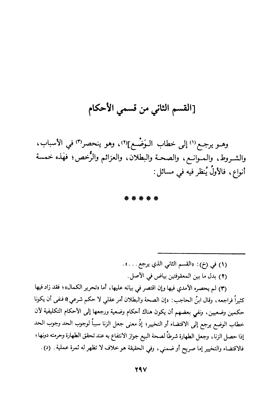 3 لم يحصره الآمدي فيها وإن اقتصر في بيانه عليها، أما "تحرير الكمال" فقد زاد فيها كثيرا فراجعه، وقال ابن الحاجب: "إن الصحة والبطلان أمر عقلي لا حكم شرعي؛ فنفى أن يكونا حكمين وضعيين، ونفي بعضهم أن يكون هناك أحكام وضعية ورجعها إلى الأحكام التكليفية؛ لأن خطاب الوضع يرجع إلى الاقتضاء أو التخيير؛ إذ معنى جعل الزنى سببا لوجوب الحد وجوب الحد إذا حصل الزنى، وجعل الطهارة شرطا لصحة البيع جواز الانتفاع به عند تحقق الطهارة وحرمته دونها؛ فالاقتضاء والتخيير إما صريح أو ضمني, وفي الحقيقة هو خلاف لا تظهر له ثمرة عملية. "د".