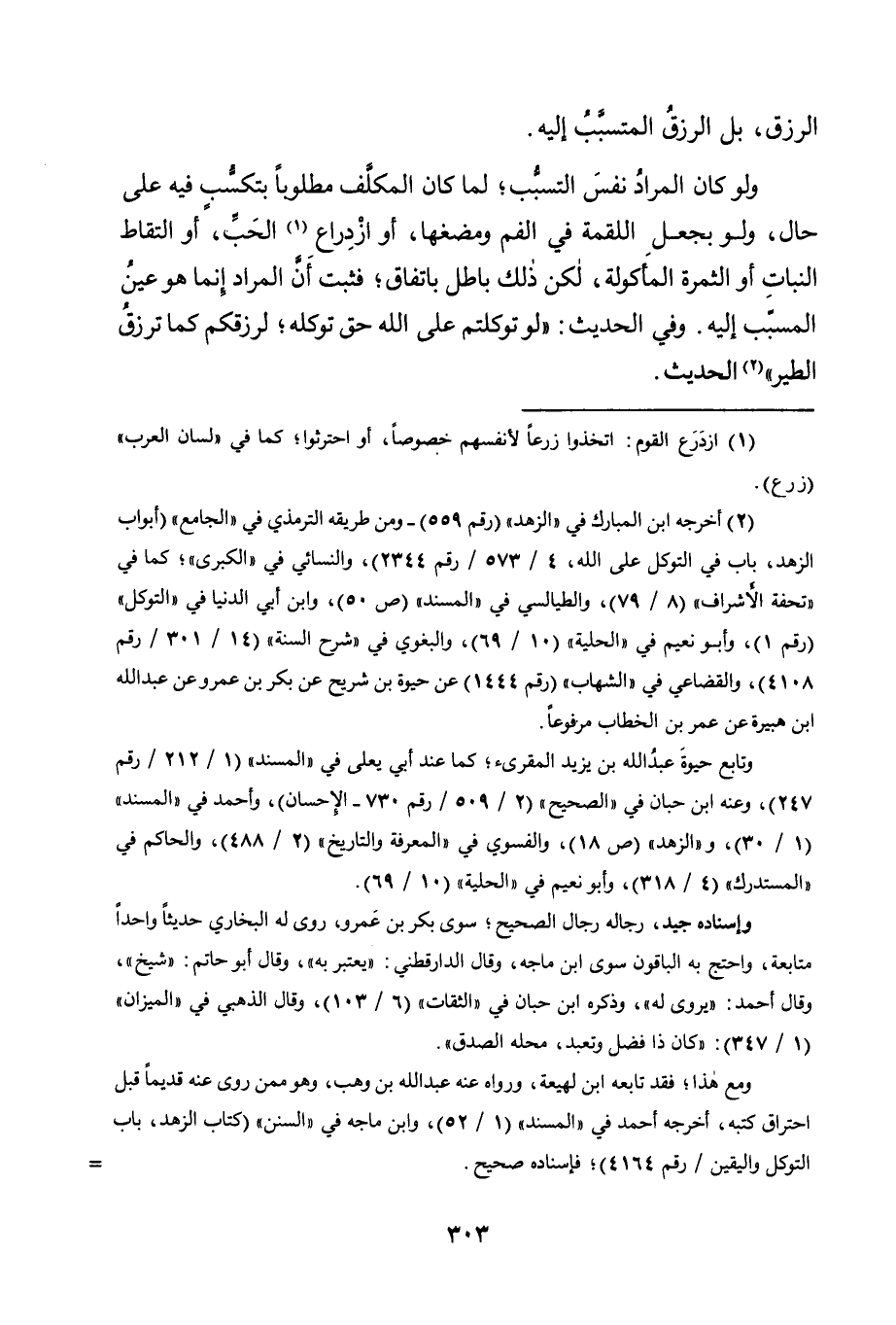 2 أخرجه ابن المبارك في "الزهد" "رقم 559" -ومن طريقه الترمذي في "الجامع" "أبواب الزهد، باب في التوكل على الله، 4/ 573/ رقم 2344", والنسائي في "الكبرى"؛ كما في "تحفة الأشراف" "8/ 79", والطيالسي في "المسند" "ص50"، وابن أبي الدنيا في "التوكل" "رقم 1"، وأبو نعيم في "الحلية" "10/ 69"، والبغوي في شرح السنة" "14/ 301/ رقم 4108"، والقضاعي في "الشهاب" "رقم 1444" عن حيوة بن شريح عن بكر بن عمرو عن عبد الله بن هبيرة عن عمر بن الخطاب مرفوعا.