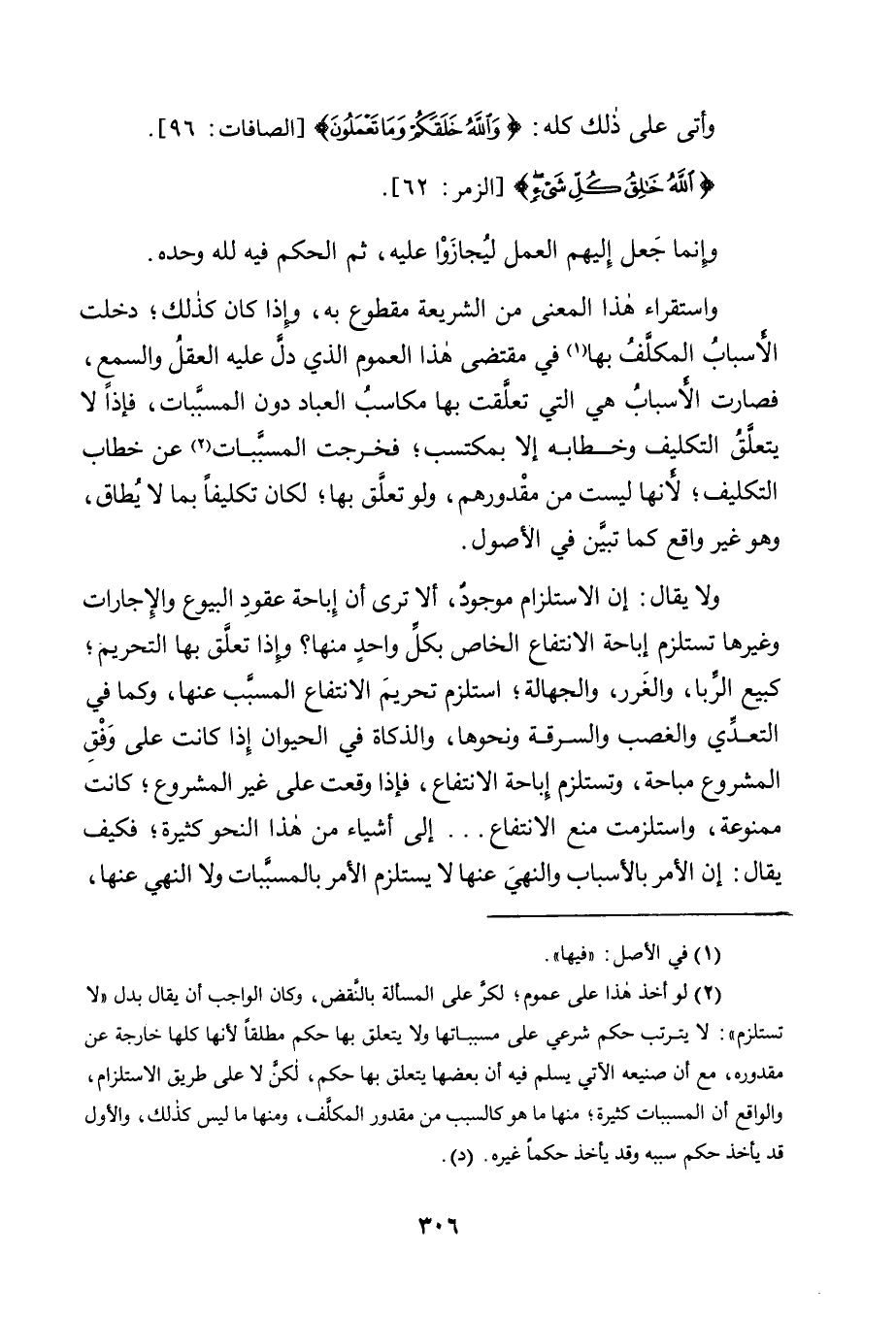 2 لو أخذ هذا على عموم؛ لكرّ على المسألة بالنقض, وكان الواجب أن يقال بدل "لا تستلزم": لا يترتب حكم شرعي على مسبباتها ولا يتعلق بها حكم مطلقا؛ لأنها كلها خارجة عن مقدوره، مع أن صنيعه الآتي يسلم فيه أن بعضها يتعلق بها حكم، لكن لا على طريق الاستلزام، والواقع أن المسببات كثيرة؛ منها ما هو كالسبب من مقدور المكلف، ومنها ما ليس كذلك، والأول قد يأخذ حكم سببه وقد يأخذ حكما غيره. "د".