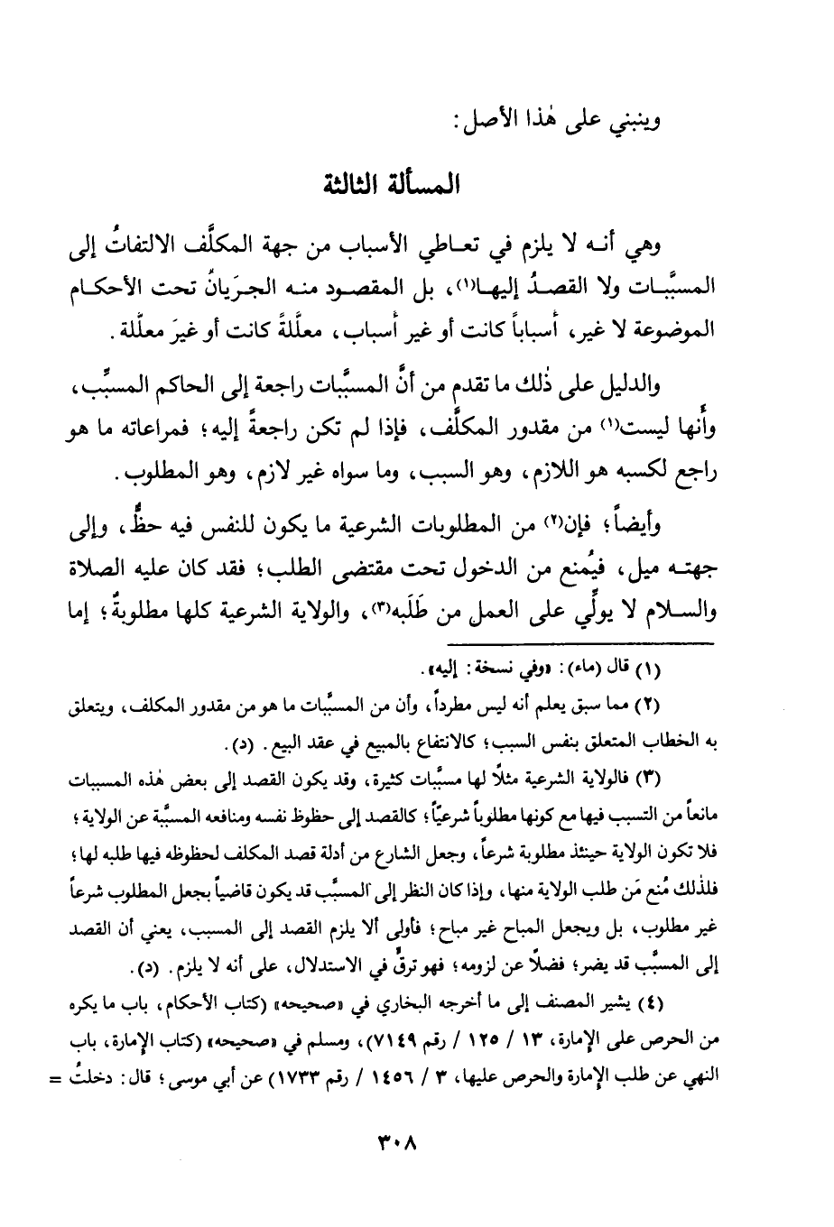 3 فالولاية الشرعية مثلا لها مسببات كثيرة، وقد يكون القصد إلى بعض هذه المسببات مانعا من التسبب فيها مع كونها مطلوبا شرعيا؛ كالقصد إلى حظوظ نفسه ومنافعه المسببة عن الولاية؛ فلا تكون الولاية حينئذ مطلوبة شرعا, وجعل الشارع من أدلة قصد المكلف لحظوظه فيها طلبه لها, فلذلك منع من طلب الولاية منها، وإذا كان النظر إلى المسبب قد يكون قاضيا بجعل المطلوب شرعا غير مطلوب، بل ويجعل المباح غير مباح؛ فأولى ألا يلزم القصد إلى المسبب, يعني أن القصد إلى المسبب قد يضر؛ فضلا عن لزومه؛ فهو ترقٍّ في الاستدلال، على أنه لا يلزم. "د".