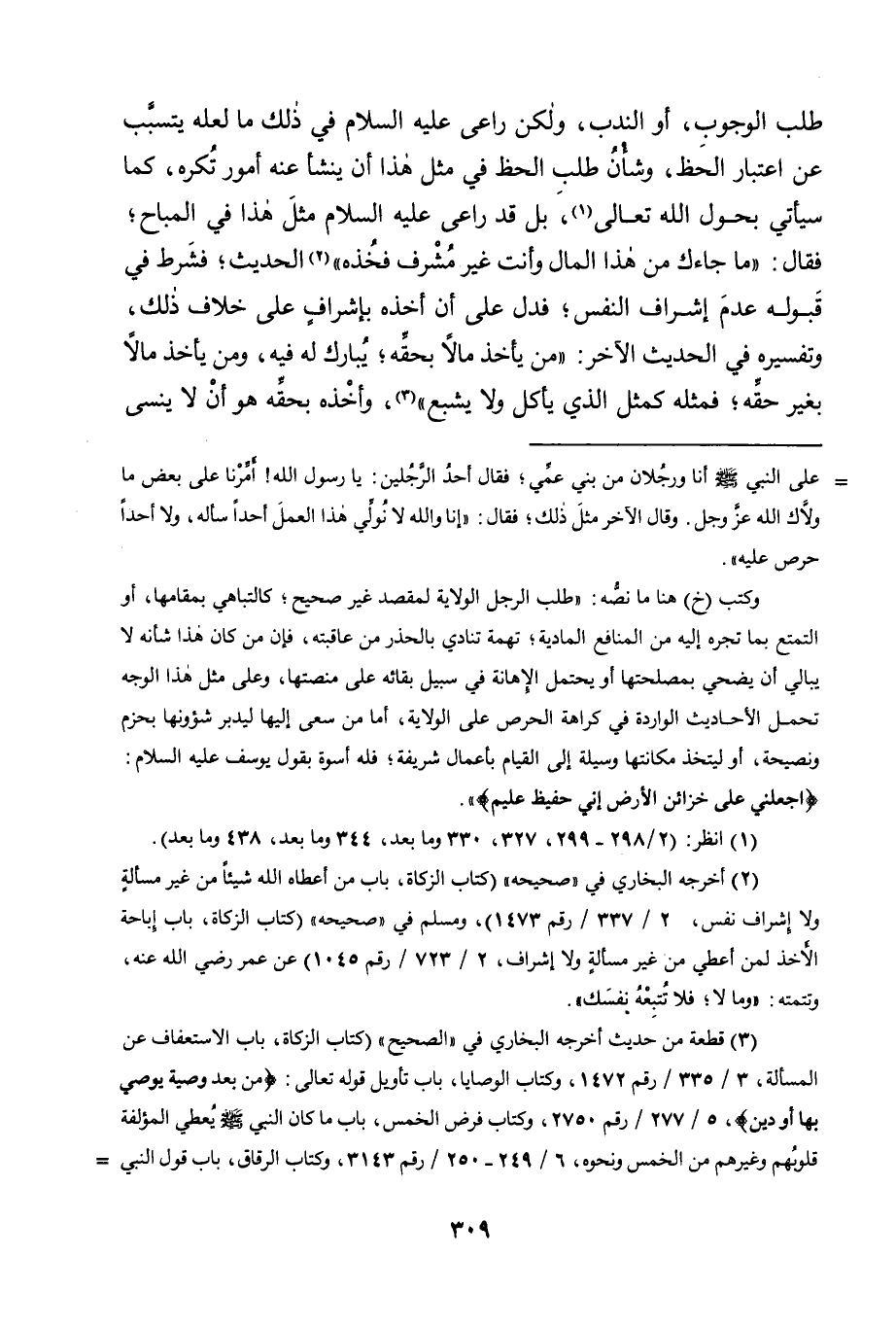 وكتب "خ" هنا ما نصه: "طلب الرجل الولاية لمقصد غير صحيح؛ كالتباهي بمقامها، أو التمتع بما تجره إليه من المنافع المادية؛ تهمة تنادي بالحذر من عاقبته، فإن من كان هذا شأنه لا يبالي أن يضحي بمصلحتها أو يحتمل الإهانة في سبيل بقائه على منصتها، وعلى مثل هذا الوجه تحمل الأحاديث الواردة في كراهة الحرص على الولاية، أما من سعى إليها ليدبر شئونها بحزم ونصيحة، أو ليتخذ مكانتها وسيلة إلى القيام بأعمال شريفة؛ فله أسوة بقول يوسف, عليه السلام: {اجْعَلْنِي عَلَى خَزَائِنِ الْأَرْضِ إِنِّي حَفِيظٌ عَلِيمٌ} ".