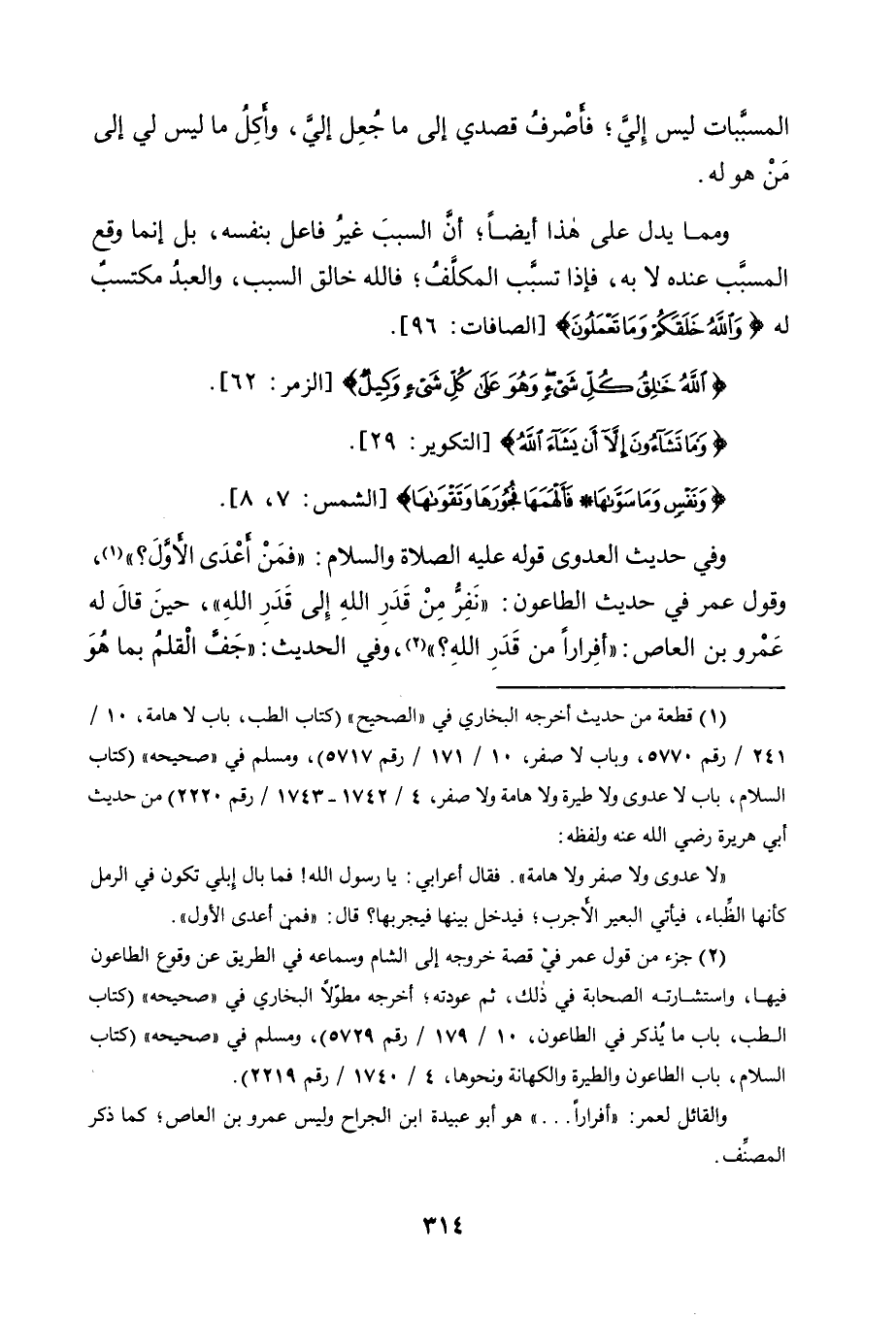 وَفِي حَدِيثِ الْعَدْوَى قَوْلُهُ, عَلَيْهِ الصَّلَاةُ وَالسَّلَامُ: "فَمَنْ أَعْدَى الْأَوَّلَ؟ " 1، وَقَوْلُ عُمَرَ فِي حَدِيثِ الطَّاعُونِ: "نَفِرُّ مِنْ قَدَرِ اللَّهِ إِلَى قَدَرِ اللَّهِ"، حِينَ قَالَ لَهُ عَمْرُو بْنُ الْعَاصِ: "أَفِرَارًا مِنْ قَدَرَ اللَّهِ؟ "2، وَفِي الحديث: "جف القلم بما هو