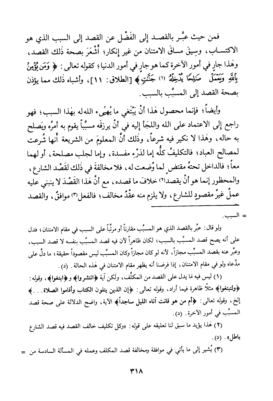 وَأَيْضًا؛ فَإِنَّمَا مَحْصُولُ هَذَا أَنْ يُبْتَغَى مَا يُهَيِّئُ اللَّهُ لَهُ بِهَذَا السَّبَبِ؛ فَهُوَ رَاجِعٌ إِلَى الِاعْتِمَادِ عَلَى اللَّهِ وَاللَّجَأِ إِلَيْهِ فِي أَنْ يَرْزُقَهُ مُسَبَّبًا يَقُومُ بِهِ أَمْرُهُ وَيَصْلُحُ بِهِ حَالُهُ, وَهَذَا لَا نَكِيرَ فِيهِ شَرْعًا، وَذَلِكَ أَنَّ الْمَعْلُومَ من الشريعة أنها شُرِعَتْ لِمَصَالِحِ الْعِبَادِ؛ فَالتَّكْلِيفُ كُلُّهُ إِمَّا لِدَرْءِ مَفْسَدَةٍ، وَإِمَّا لِجَلْبِ مَصْلَحَةٍ، أَوْ لَهُمَا مَعًا؛ فَالدَّاخِلُ تَحْتَهُ مُقْتَضٍ لِمَا وُضِعَتْ لَهُ، فَلَا مُخَالَفَةَ فِي ذَلِكَ لِقَصْدِ الشَّارِعِ، وَالْمَحْظُورُ إِنَّمَا هُوَ أَنْ يَقْصِدَ2 خِلَافَ مَا قَصَدَهُ، مَعَ أَنَّ هَذَا الْقَصْدَ لَا يَنْبَنِي عَلَيْهِ عَمَلٌ غَيْرُ مَقْصُودٍ لِلشَّارِعِ، وَلَا يَلْزَمُ مِنْهُ عَقْدٌ مخالف؛ فالفعل3 موافق، والقصد