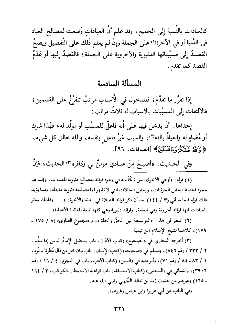 3 أخرجه البخاري في "الصحيح" "كتاب الأذان، باب يستقبل الإمام الناس إذا سلم، 2/ 333/ رقم 846"، ومسلم في "صحيحه" "كتاب الإيمان، باب بيان كفر من قال مطرنا بالنوء، 1/ 83-84/ رقم 71"، وأبو داود في "السنن" "كتاب الأدب، باب في النجوم، 4/ 16/ رقم 3906"، والنسائي في "المجتبى" "كتاب الاستسقاء، باب كراهية الاستمطار بالكواكب، 3/ 164-165" وغيرهم من حديث زيد بن خالد الجهني, رضي الله عنه.