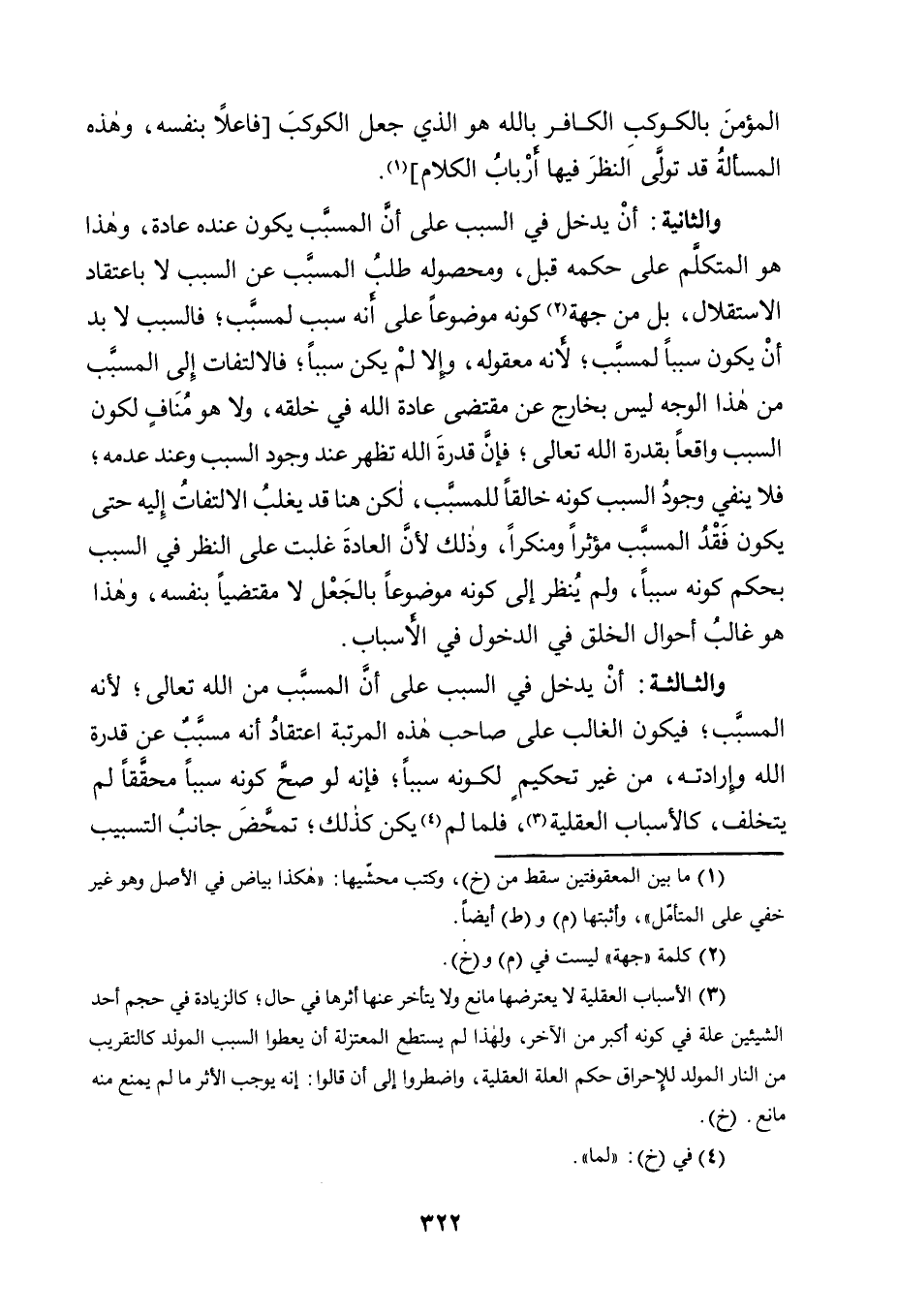 3 الأسباب العقلية لا يعترضها مانع ولا يتأخر عنها أثرها في حال؛ كالزيادة في حجم أحد الشيئين علة في كونه أكبر من الآخر، ولهذا لم يستطع المعتزلة أن يعطوا السبب المولد كالتقريب من النار المولد للإحراق حكم العلة العقلية، واضطروا إلى أن قالوا: إنه يوجب الأثر ما لم يمنع منه مانع. "خ".