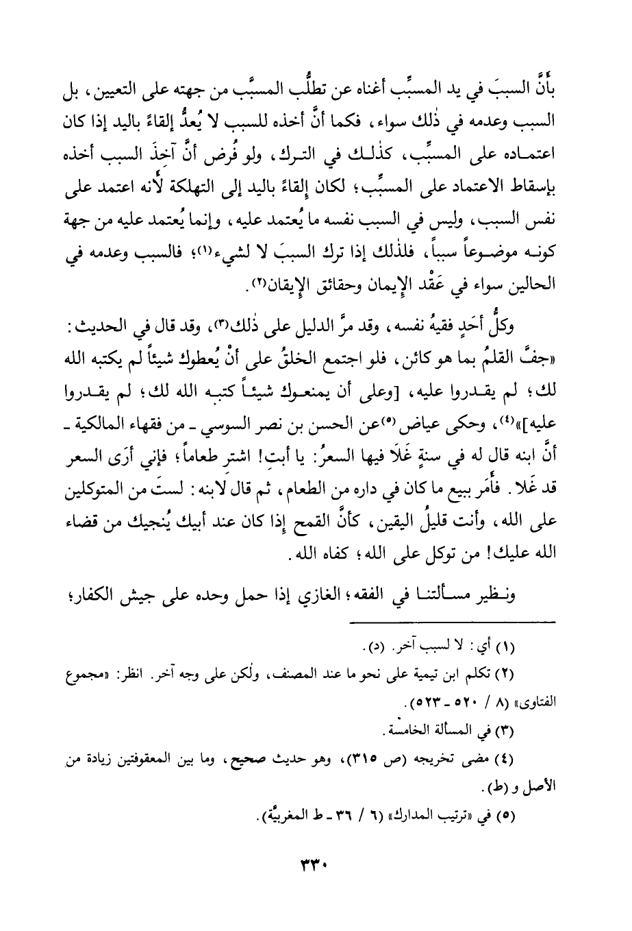 بِأَنَّ السَّبَبَ فِي يَدِ الْمُسَبِّبِ أَغْنَاهُ عَنْ تطلب المسبب من جهته على التعيين، بَلِ السَّبَبُ وَعَدَمُهُ فِي ذَلِكَ سَوَاءٌ، فَكَمَا أَنَّ أَخْذَهُ لِلسَّبَبِ لَا يُعَدُّ إِلْقَاءً بِالْيَدِ إِذَا كَانَ اعْتِمَادُهُ عَلَى الْمُسَبِّبِ، كَذَلِكَ فِي التَّرْكِ، وَلَوْ فُرِضَ أَنَّ آخِذَ السَّبَبِ أَخَذَهُ بِإِسْقَاطِ الِاعْتِمَادِ عَلَى الْمُسَبِّبِ؛ لَكَانَ إِلْقَاءً بِالْيَدِ إِلَى التَّهْلُكَةِ لِأَنَّهُ اعْتَمَدَ عَلَى نَفْسِ السَّبَبِ، وَلَيْسَ فِي السَّبَبِ نَفْسِهِ مَا يُعْتَمَدُ عَلَيْهِ, وَإِنَّمَا يُعْتَمَدُ عَلَيْهِ مِنْ جِهَةِ كَوْنِهِ مَوْضُوعًا سببا، فلذلك إِذَا تُرِكَ السَّبَبُ لَا لِشَيْءٍ1؛ فَالسَّبَبُ وَعَدَمُهُ فِي الْحَالَيْنِ سَوَاءٌ فِي عَقْدِ الْإِيمَانِ وَحَقَائِقِ الْإِيقَانِ2.