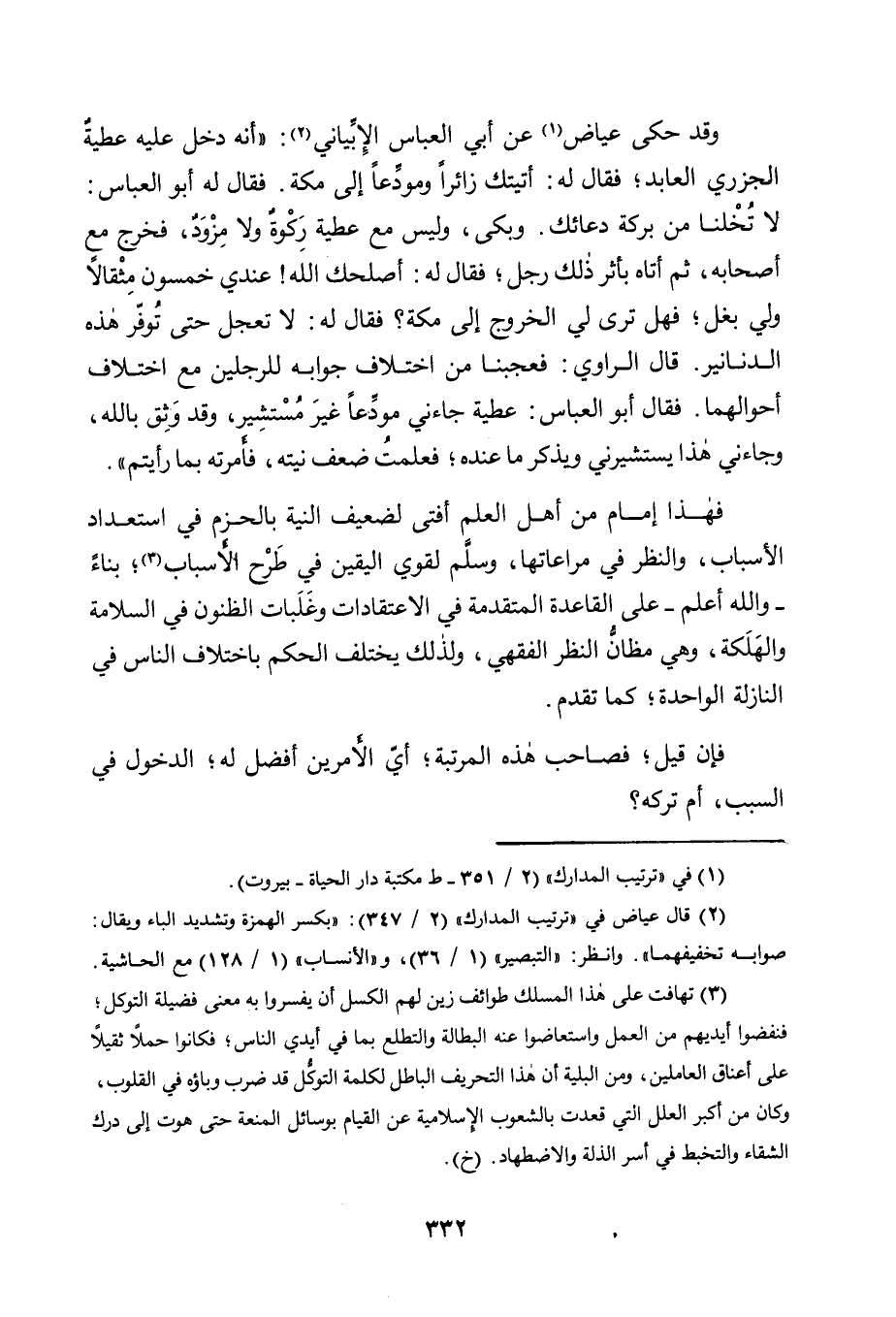 وَقَدْ حَكَى عِيَاضٌ1 عَنْ أَبِي الْعَبَّاسِ الْإِبَّيَانِيِّ2: "أَنَّهُ دَخَلَ عَلَيْهِ عَطِيَّةُ الْجَزَرِيُّ الْعَابِدُ؛ فَقَالَ لَهُ: أَتَيْتُكَ زَائِرًا وَمُوَدِّعًا إِلَى مَكَّةَ. فَقَالَ لَهُ أَبُو الْعَبَّاسِ: لَا تُخْلِنَا مِنْ بَرَكَةِ دُعَائِكَ. وَبَكَى، وَلَيْسَ مَعَ عَطِيَّةَ رَكْوَةٌ وَلَا مِزْوَدٌ، فَخَرَجَ مَعَ أَصْحَابِهِ, ثُمَّ أَتَاهُ بِأَثَرِ ذَلِكَ رَجُلٌ؛ فَقَالَ لَهُ: أَصْلَحَكَ اللَّهُ! عِنْدِي خَمْسُونَ مِثْقَالًا وَلِي بَغْلٌ؛ فَهَلْ تَرَى لِي الْخُرُوجَ إِلَى مَكَّةَ؟ فَقَالَ لَهُ: لَا تَعْجَلْ حَتَّى تُوَفِّرَ هَذِهِ الدَّنَانِيرَ. قَالَ الرَّاوِي: فَعَجِبْنَا مِنَ اخْتِلَافِ جَوَابِهِ لِلرَّجُلَيْنِ مَعَ اخْتِلَافِ أَحْوَالِهِمَا. فَقَالَ أَبُو الْعَبَّاسِ: عَطِيَّةُ جَاءَنِى مُوَدِّعًا غَيْرَ مُسْتَشِيرٍ، وَقَدْ وَثِقَ بِاللَّهِ، وَجَاءَنِي هَذَا يَسْتَشِيرُنِي وَيَذْكُرُ مَا عِنْدَهُ؛ فَعَلِمْتُ ضَعْفَ نِيَّتِهِ، فَأَمَرْتُهُ بِمَا رَأَيْتُمْ".