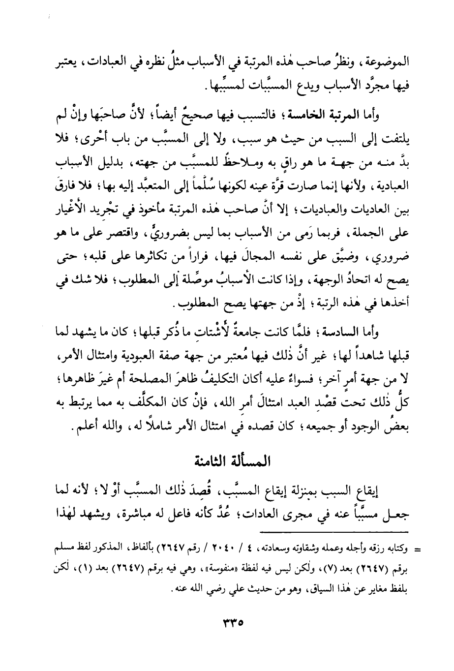 الْمَوْضُوعَةِ، وَنَظَرُ صَاحِبِ هَذِهِ الْمَرْتَبَةِ فِي الْأَسْبَابِ مِثْلُ نَظَرِهِ فِي الْعِبَادَاتِ، يَعْتَبِرُ فِيهَا مُجَرَّدَ الْأَسْبَابِ وَيَدَعُ الْمُسَبَّبَاتِ لِمُسَبِّبِهَا.