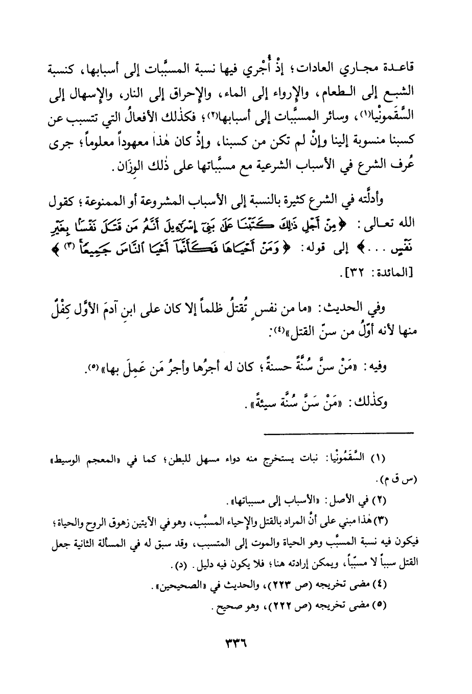 وَأَدِلَّتُهُ فِي الشَّرْعِ كَثِيرَةٌ بِالنِّسْبَةِ إِلَى الْأَسْبَابِ الْمَشْرُوعَةِ أَوِ الْمَمْنُوعَةِ؛ كَقَوْلِ اللَّهِ تَعَالَى: {مِنْ أَجْلِ ذَلِكَ كَتَبْنَا عَلَى بَنِي إِسْرائيلَ أَنَّهُ مَنْ قَتَلَ نَفْسًا بِغَيْرِ نَفْسٍ ... } إِلَى قَوْلِهِ: {وَمَنْ أَحْيَاهَا فَكَأَنَّمَا أَحْيَا النَّاسَ جَمِيعًا 3} [الْمَائِدَةِ: 32] .
