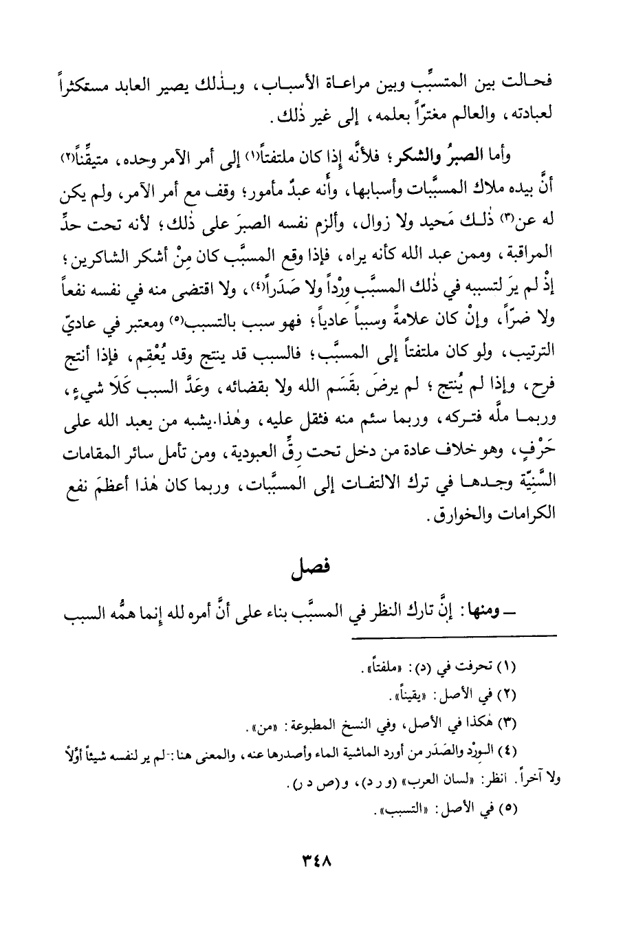 وَأَمَّا الصَّبْرُ وَالشُّكْرُ؛ فَلِأَنَّهُ إذا كان ملتفتا1 إِلَى أَمْرِ الْآمِرِ وَحْدَهُ، مُتَيَقِّنًا2 أَنَّ بِيَدِهِ مِلَاكَ الْمُسَبَّبَاتِ وَأَسْبَابِهَا، وَأَنَّهُ عَبْدٌ مَأْمُورٌ؛ وَقَفَ مع أمر الآمر، ولم يكن له عن3 ذَلِكَ مَحِيدٌ وَلَا زَوَالٌ، وَأَلْزَمَ نَفْسَهُ الصَّبْرَ عَلَى ذَلِكَ؛ لِأَنَّهُ تَحْتَ حَدِّ الْمُرَاقَبَةِ، وَمِمَّنْ عَبَدَ اللَّهَ كَأَنَّهُ يَرَاهُ، فَإِذَا وَقَعَ الْمُسَبَّبُ كَانَ مِنْ أَشْكَرِ الشَّاكِرِينَ؛ إِذْ لَمْ يَرَ لِتَسَبُّبِهِ فِي ذَلِكَ الْمُسَبَّبِ وِرْدا وَلَا صَدَرا4، وَلَا اقْتَضَى مِنْهُ فِي نَفْسِهِ نَفْعًا وَلَا ضَرًّا، وَإِنْ كَانَ عَلَامَةً وَسَبَبًا عَادِيًّا؛ فَهُوَ سَبَبٌ بِالتَّسَبُّبِ5 وَمُعْتَبَرٌ فِي عَادِيِّ التَّرْتِيبِ، وَلَوْ كَانَ مُلْتَفِتًا إِلَى الْمُسَبَّبِ؛ فَالسَّبَبُ قَدْ يُنْتِجُ وَقَدْ يُعْقِمُ، فَإِذَا أَنْتَجَ فَرِحَ، وَإِذَا لَمْ يُنْتِجْ؛ لَمْ يَرْضَ بِقَسْمِ اللَّهِ وَلَا بِقَضَائِهِ، وَعَدَّ السَّبَبَ كَلَا شَيْءٍ، وَرُبَّمَا مَلَّهُ فَتَرَكَهُ، وَرُبَّمَا سَئِمَ مِنْهُ فَثَقُلَ عَلَيْهِ، وَهَذَا يُشْبِهُ مَنْ يَعْبُدُ اللَّهَ عَلَى حَرْفٍ، وَهُوَ خِلَافُ عَادَةِ مَنْ دَخَلَ تَحْتَ رِقِّ الْعُبُودِيَّةِ، وَمَنْ تَأَمَّلَ سَائِرَ الْمَقَامَاتِ السَّنِيَّةِ وَجَدَهَا فِي تَرْكِ الِالْتِفَاتِ إِلَى الْمُسَبَّبَاتِ، وَرُبَّمَا كَانَ هَذَا أَعْظَمَ نفع الْكَرَامَاتِ وَالْخَوَارِقِ.