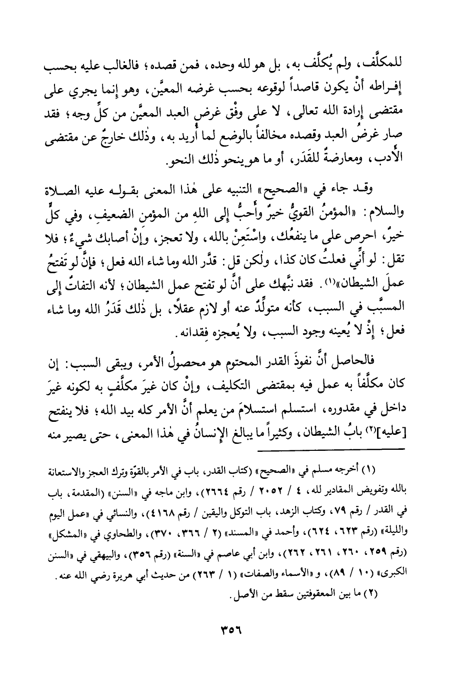 وَقَدْ جَاءَ فِي "الصَّحِيحِ" التَّنْبِيهُ عَلَى هَذَا الْمَعْنَى بِقُولِهِ, عَلَيْهِ الصَّلَاةُ وَالسَّلَامُ: "الْمُؤْمِنُ الْقَوِيُّ خَيْرٌ وَأَحَبُّ إِلَى اللَّهِ مِنَ الْمُؤْمِنِ الضَّعِيفِ، وَفِي كُلٍّ خَيْرٌ، احْرِصْ عَلَى مَا يَنْفَعُكَ، وَاسْتَعِنْ بِاللَّهِ، وَلَا تَعْجِزْ، وَإِنْ أَصَابَكَ شَيْءٌ؛ فَلَا تَقُلْ: لَوْ أَنِّي فَعَلْتُ كَانَ كَذَا، وَلَكِنْ قُلْ: قدر الله وما شاء الله فَعَلَ؛ فَإِنَّ لَوْ تَفْتَحُ عَمَلَ الشَّيْطَانِ" 1. فَقَدْ نَبَّهَكَ عَلَى أَنَّ لَوْ تَفْتَحُ عَمَلَ الشَّيْطَانِ؛ لِأَنَّهُ الْتِفَاتٌ إِلَى الْمُسَبَّبِ فِي السَّبَبِ، كَأَنَّهُ مُتَوَلِّدٌ عَنْهُ أَوْ لَازِمٌ عَقْلًا، بَلْ ذَلِكَ قَدَرُ اللَّهِ وَمَا شَاءَ فَعَلَ؛ إِذْ لَا يُعِينُهُ وُجُودُ السَّبَبِ، وَلَا يُعْجِزُهُ فُقْدَانُهُ.