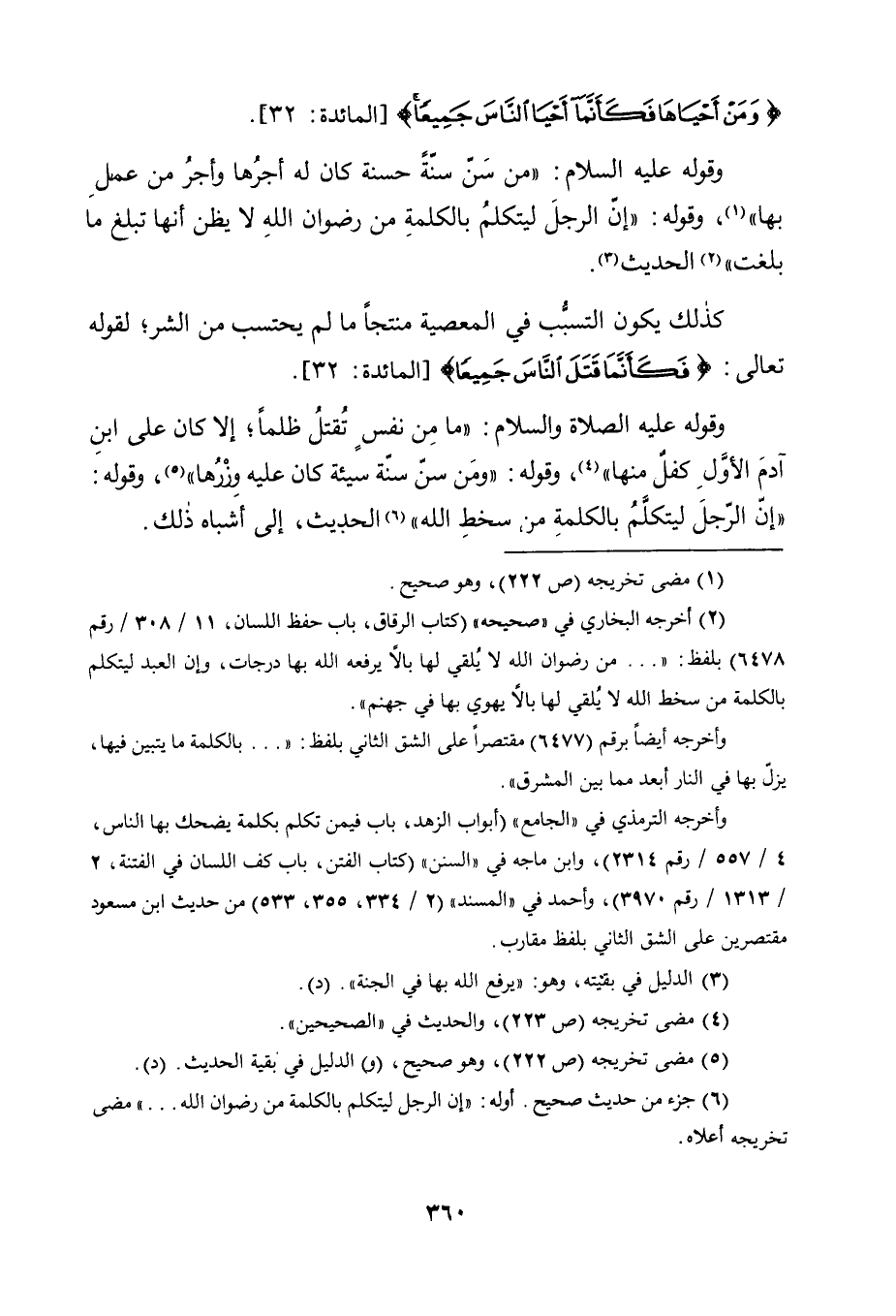 وَقَوْلِهِ, عَلَيْهِ الصَّلَاةُ وَالسَّلَامُ: "مَا مِنْ نَفْسٍ تُقْتَلُ ظُلْمًا؛ إِلَّا كَانَ عَلَى ابْنِ آدَمَ الْأَوَّلِ كِفْلٌ مِنْهَا" 4، وَقَوْلِهِ: "وَمَنْ سَنَّ سُنَّةً سَيِّئَةً كَانَ عَلَيْهِ وِزْرُهَا" 5، وَقَوْلِهِ: "إِنَّ الرَّجُلَ لَيَتَكَلَّمُ بِالْكَلِمَةِ مِنْ سَخَطِ اللَّهِ" 6 الْحَدِيثَ، إِلَى أَشْبَاهِ ذَلِكَ.
