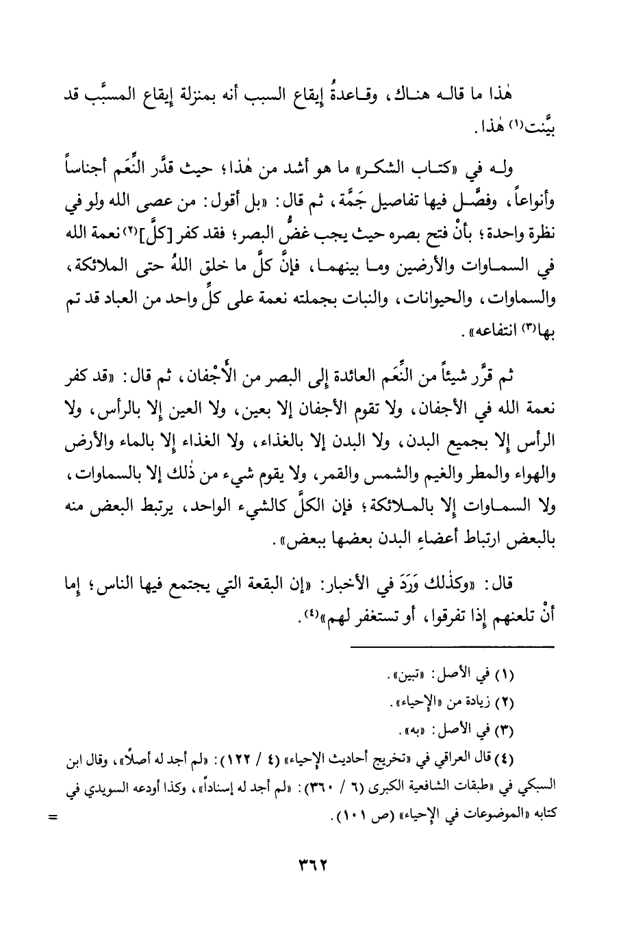 وَلَهُ فِي "كِتَابِ الشُّكْرِ" مَا هُوَ أَشَدُّ مِنْ هَذَا؛ حَيْثُ قَدَّرَ النِّعَمَ أَجْنَاسًا وَأَنْوَاعًا، وَفَصَّلَ فِيهَا تَفَاصِيلَ جَمَّةً، ثُمَّ قَالَ: "بَلْ أَقُولُ مَنْ عَصَى اللَّهَ وَلَوْ فِي نَظْرَةٍ وَاحِدَةٍ؛ بِأَنْ فَتَحَ بَصَرَهُ حَيْثُ يَجِبُ غَضُّ البصر؛ فقد كفر [كل] 2 نعمة الله في السموات وَالْأَرَضِينَ وَمَا بَيْنَهُمَا, فَإِنَّ كُلَّ مَا خَلَقَ الله حتى الملائكة, والسموات، وَالْحَيَوَانَاتِ، وَالنَّبَاتِ بِجُمْلَتِهِ نِعْمَةٌ عَلَى كُلِّ وَاحِدٍ مِنَ الْعِبَادِ قَدْ تَمَّ بِهَا3 انْتِفَاعُهُ".