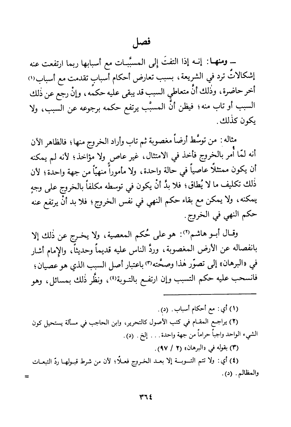 وَقَالَ أَبُو هَاشِمٍ2: هُوَ عَلَى حُكْمِ الْمَعْصِيَةِ، وَلَا يَخْرُجُ عَنْ ذَلِكَ إِلَّا بِانْفِصَالِهِ عَنِ الْأَرْضِ الْمَغْصُوبَةِ، وَرَدَّ النَّاسُ عَلَيْهِ قَدِيمًا وَحَدِيثًا، وَالْإِمَامُ أَشَارَ فِي "الْبُرْهَانِ" إِلَى تَصَوُّرِ هَذَا وَصِحَّتِهِ3 بِاعْتِبَارِ أَصْلِ السَّبَبِ الَّذِي هُوَ عِصْيَانٌ؛ فَانْسَحَبَ عَلَيْهِ حُكْمُ التَّسَبُّبِ وَإِنِ ارْتَفَعَ بِالتَّوْبَةِ4، ونظر ذلك بمسائل، وهو