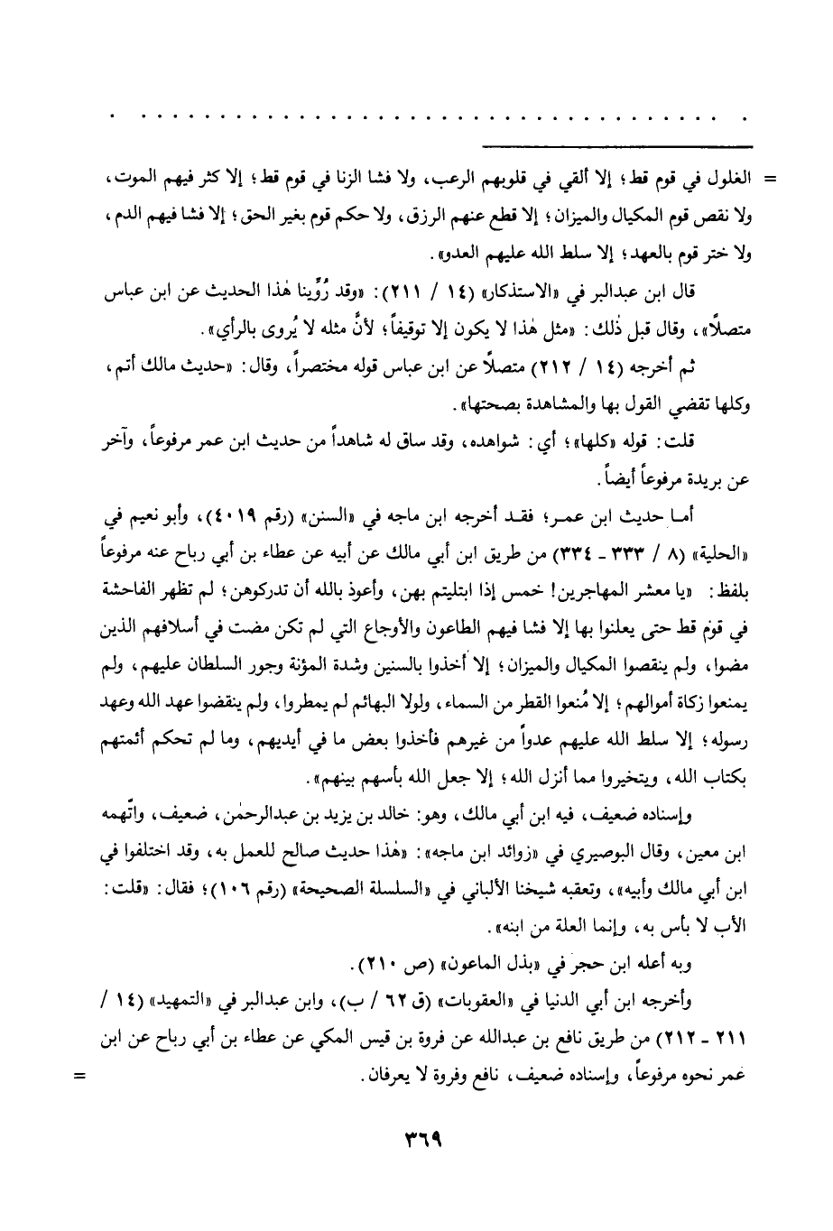 أما حديث ابن عمر؛ فقد أخرجه ابن ماجه في "السنن" "رقم 4019"، وأبو نعيم في "الحلية" "8/ 333-334" من طريق ابن أبي مالك عن أبيه عن عطاء بن أبي رباح عنه مرفوعا بلفظ: "يا معشر المهاجرين! خمس إذا ابتليتم بهن، وأعوذ بالله أن تدركوهن؛ لم تظهر الفاحشة في قوم قط حتى يعلنوا بها إلا فشا فيهم الطاعون والأوجاع التي لم تكن مضت في أسلافهم الذين مضوا، ولم ينقصوا المكيال والميزان؛ إلا أخذوا بالسنين وشدة المؤنة وجور السلطان عليهم، ولم يمنعوا زكاة أموالهم؛ إلا منعوا القطر من السماء، ولولا البهائم لم يمطروا، ولم ينقضوا عهد الله وعهد رسوله؛ إلا سلط الله عليهم عدوا من غيرهم, فأخذوا بعض ما في أيديهم، وما لم تحكم أئمتهم بكتاب الله، ويتخيروا مما أنزل الله؛ إلا جعل الله بأسهم بينهم".