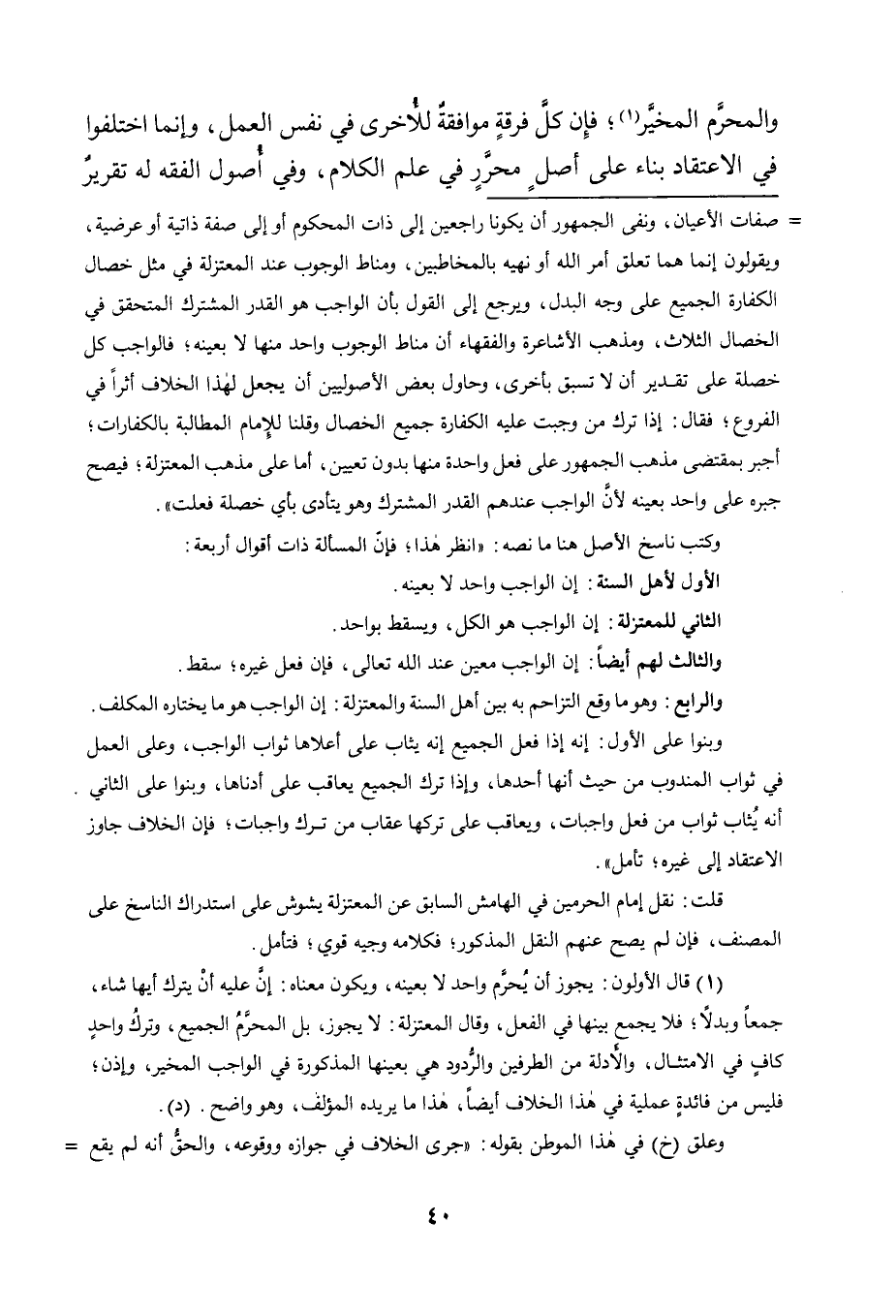 وَالْمُحَرَّمِ الْمُخَيَّرِ1؛ فَإِنَّ كُلَّ فِرْقَةٍ مُوَافِقَةٌ لِلْأُخْرَى فِي نَفْسِ الْعَمَلِ، وَإِنَّمَا اخْتَلَفُوا فِي الِاعْتِقَادِ بِنَاءً عَلَى أَصْلٍ مُحَرَّرٍ فِي عِلْمِ الْكَلَامِ، وفي أصول الفقه له تقرير