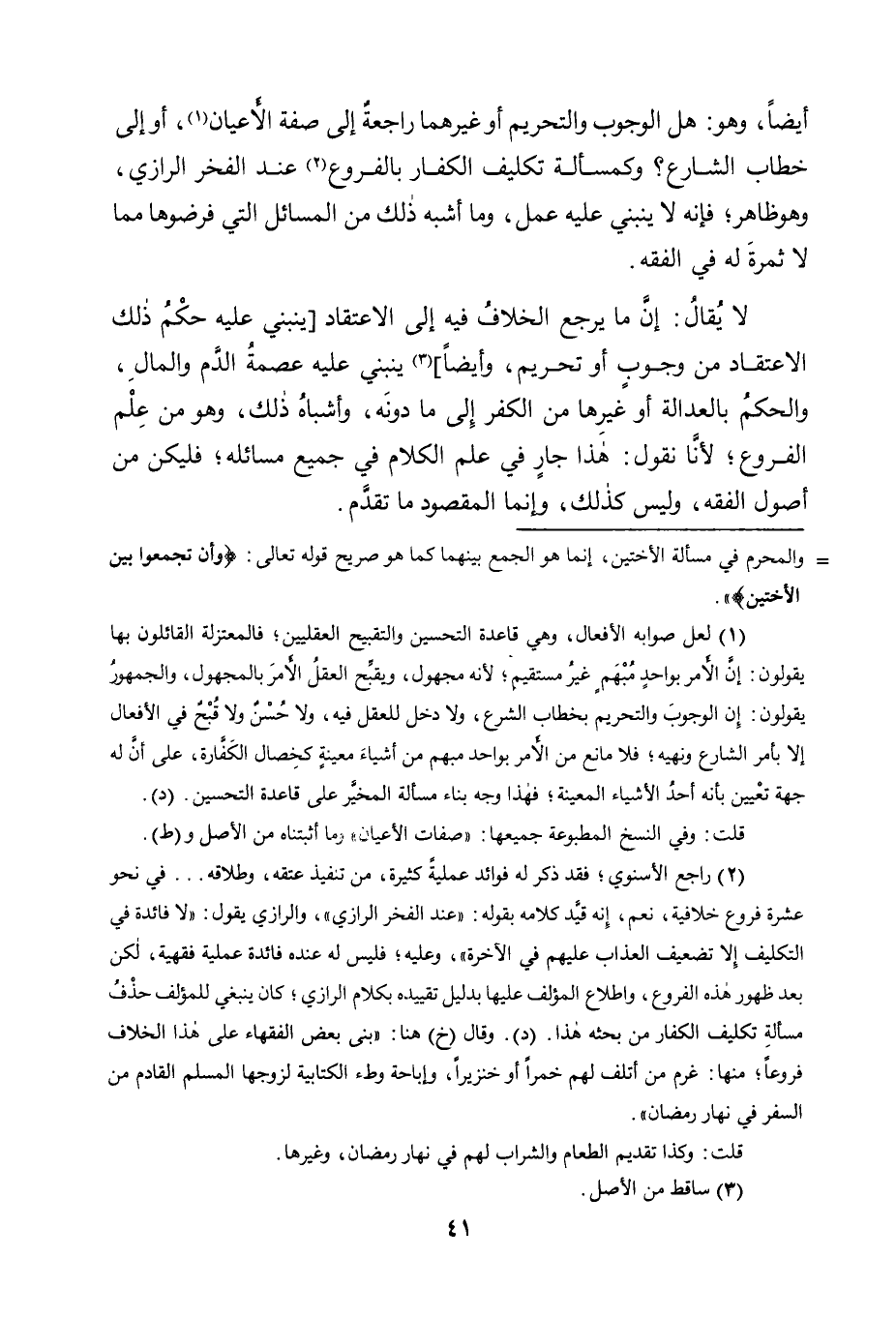 لَا يُقَالُ: إِنَّ مَا يَرْجِعُ الْخِلَافُ فِيهِ إِلَى الِاعْتِقَادِ [يَنْبَنِي عَلَيْهِ حُكْمُ ذَلِكَ الِاعْتِقَادِ مِنْ وُجُوبٍ أَوْ تَحْرِيمٍ، وَأَيْضًا] 3 يَنْبَنِي عَلَيْهِ عِصْمَةُ الدَّمِ وَالْمَالِ، وَالْحُكْمُ بِالْعَدَالَةِ أَوْ غَيْرِهَا مِنَ الْكُفْرِ إِلَى ما دونه، وأشباه ذلك، وهو مِنْ عِلْمِ الْفُرُوعِ؛ لِأَنَّا نَقُولُ: هَذَا جَارٍ فِي عِلْمِ الْكَلَامِ فِي جَمِيعِ مَسَائِلِهِ؛ فَلْيَكُنْ مِنْ أُصُولِ الْفِقْهِ، وَلَيْسَ كَذَلِكَ، وَإِنَّمَا الْمَقْصُودُ ما تقدم.