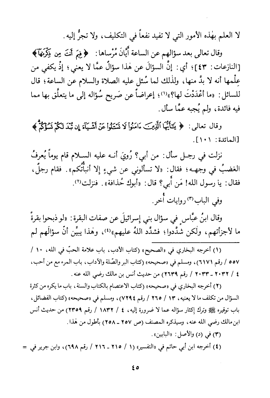 وَقَالَ تَعَالَى بَعْدَ سُؤَالِهِمْ عَنِ السَّاعَةِ أيَّان مُرْساها: {فِيمَ أَنْتَ مِنْ ذِكْرَاهَا} [النازعات: 43] ؛ أَيْ: إِنَّ السُّؤَالَ عَنْ هَذَا سُؤَالٌ عَمَّا لَا يَعْنِي؛ إِذْ يَكْفِي مِنْ عِلْمِهَا أَنَّهُ لَا بُدَّ مِنْهَا، وَلِذَلِكَ لَمَّا سُئل عَلَيْهِ الصَّلَاةُ وَالسَّلَامُ عَنِ السَّاعَةِ؛ قَالَ لِلسَّائِلِ: "مَا أَعْدَدْتَ لَهَا؟ " 1؛ إِعْرَاضًا عَنْ صَرِيحِ سُؤَالِهِ إِلَى مَا يَتَعَلَّقُ بِهَا مِمَّا فِيهِ فَائِدَةٌ، وَلَمْ يُجبه عَمَّا سَأَلَ.