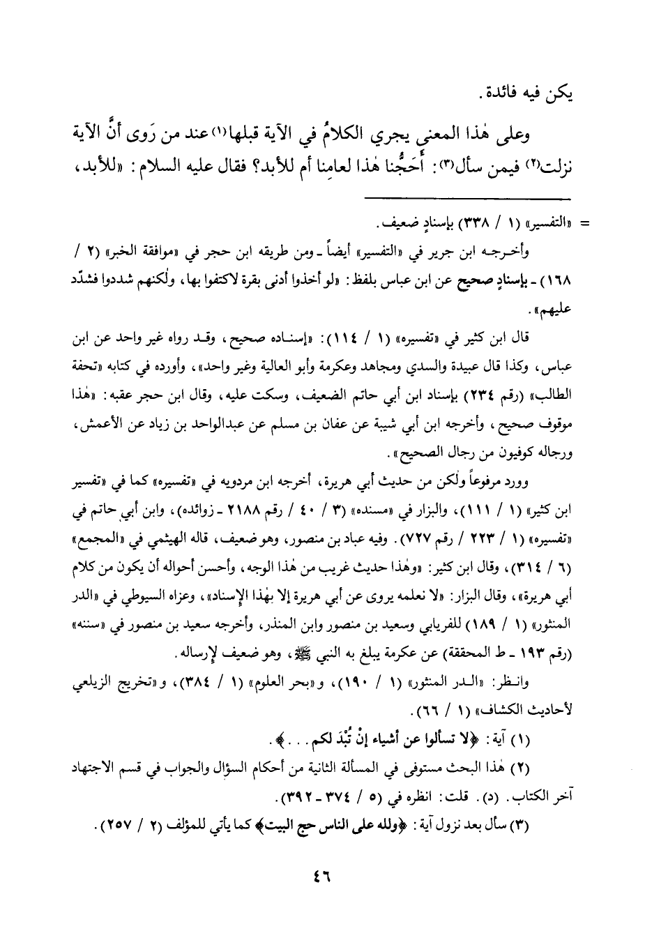 وَعَلَى هَذَا الْمَعْنَى يَجْرِي الْكَلَامُ فِي الْآيَةِ قَبْلَهَا1 عِنْدَ مَنْ رَوَى أَنَّ الْآيَةَ نَزَلَتْ2 فِيمَنْ سَأَلَ3: أحجُّنا هَذَا لعامنا أم للأبد؟ فقال عليه السلام: