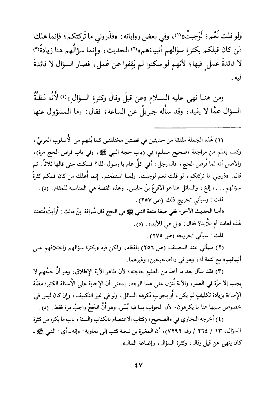 1 هذه الجملة ملفقة من حديثين في قصتين مختلفتين كما يُفهم من الأسلوب العربي، وكما يعلم من مراجعة "صحيح مسلم" في "باب حجة النبي -صلى الله عليه وسلم- وفي باب فرض الحج مرة"، والأصل أنه لما فُرض الحج؛ قال رجل: أفي كل عام يا رسول الله؟ فسكت حتى قالها ثلاثا. ثم قال: "ذروني ما تركتكم، لو قلت نعم لوجبت، ولما استطعتم، إنما أهلك من كان قبلكم كثرة سؤالهم ... " إلخ، والسائل هنا هو الأقرع بن حابس، وهذه القصة هي المناسبة للمقام "د".