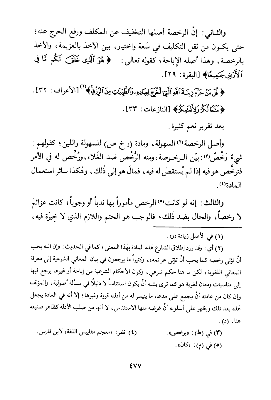 2 أي: وقد ورد إطلاق الشارع هذه المادة بهذا المعنى؛ كما في الحديث: "إن الله يجب أن تؤتى رخصه كما يحب أن تؤتى عزائمه"، وكثيرا ما يرجعون في بيان المعاني الشرعية إلى معرفة المعاني اللغوية، لكن ما هنا حكم شرعي، وكون الأحكام الشرعية من إباحة أو غيرها يرجع فيها إلى مناسبات ومعانٍ لغوية هو كما ترى يشبه أن يكون استئناسا لا دليلا في مسألة أصولية، والمؤلف وإن كان من عادته أن يجمع على مدعاه ما يتيسر له من أدلته قوية وغيرها؛ إلا أنه في العادة يجعل هذه بعد تلك ويظهر على أسلوبه أن غرضه منها الاستئناس، لا أنها من صلب الأدلة كظاهر صنيعه هنا. "د".