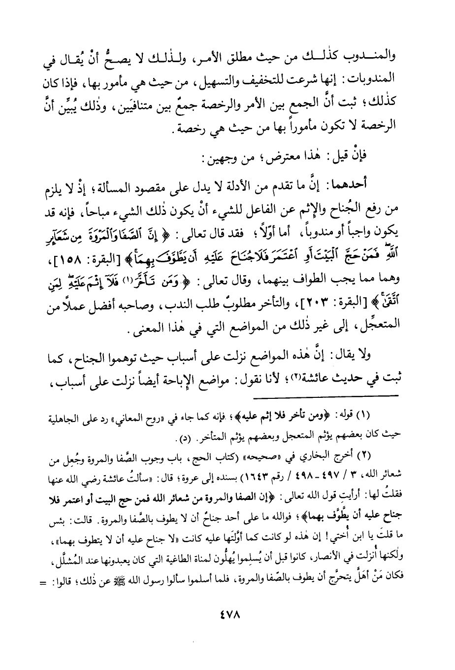 وَلَا يُقَالُ: إِنَّ هَذِهِ الْمَوَاضِعَ نَزَلَتْ عَلَى أَسْبَابٍ حَيْثُ تَوَهَّمُوا الْجُنَاحَ، كَمَا ثَبَتَ فِي حَدِيثِ عَائِشَةَ2؛ لِأَنَّا نَقُولُ: مواضع الإباحة أيضا نزلت على أسباب،
