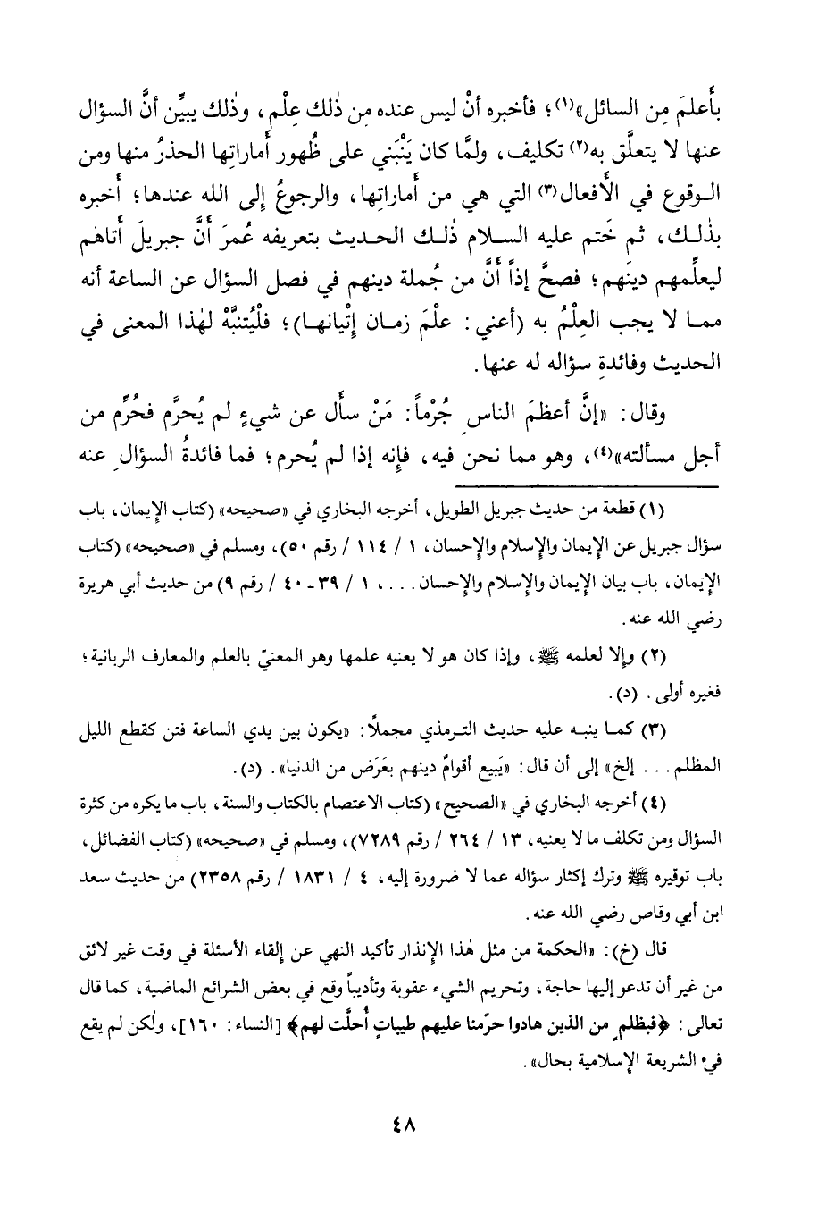 وَقَالَ: "إِنَّ أَعْظَمَ النَّاسِ جُرما: مَنْ سَأَلَ عَنْ شَيْءٍ لَمْ يُحرم فحُرِّم مِنْ أَجْلِ مَسْأَلَتِهِ" 4، وَهُوَ مِمَّا نَحْنُ فِيهِ، فَإِنَّهُ إِذَا لَمْ يُحرم؛ فَمَا فَائِدَةُ السؤال عنه