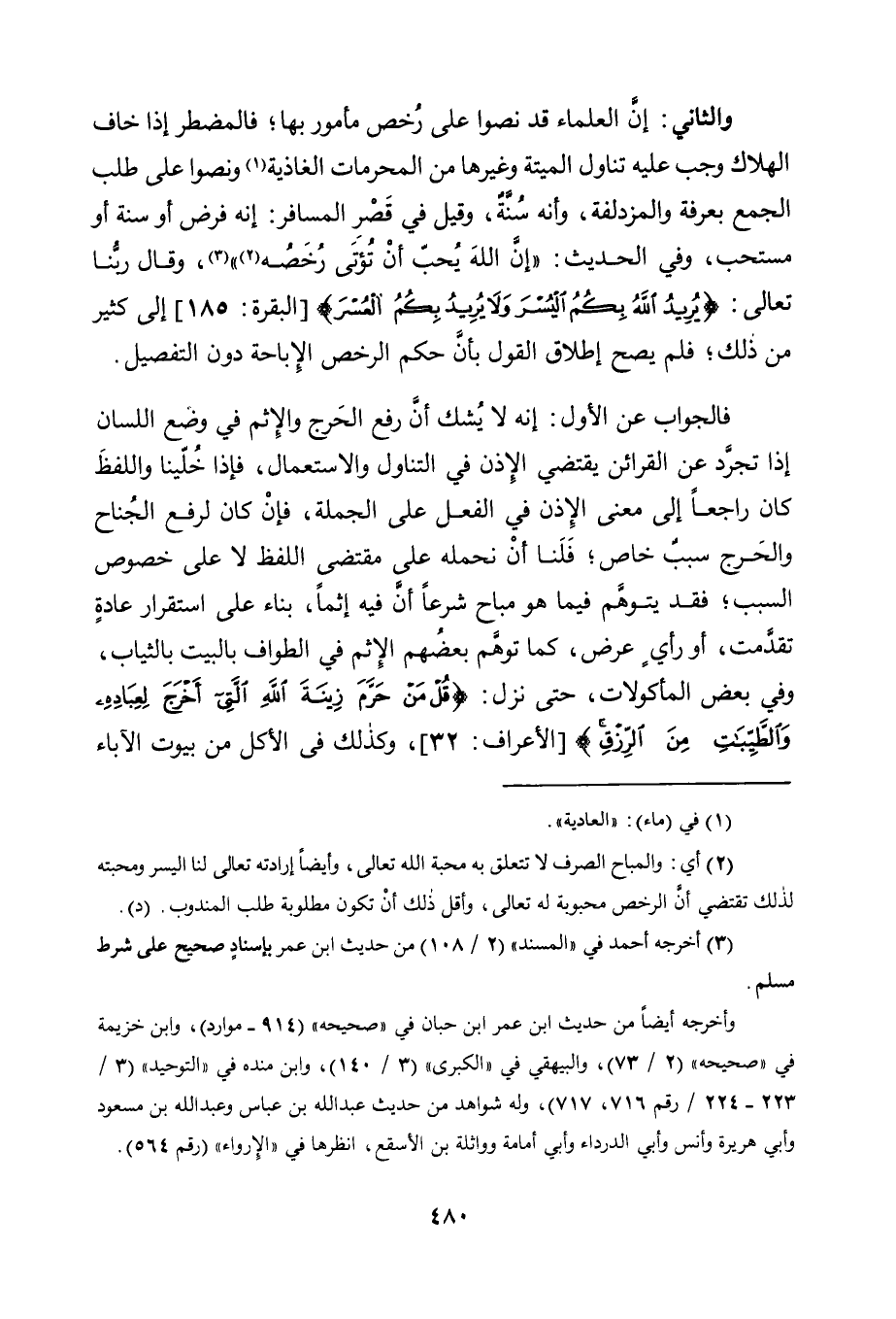 أَنَّ الْعُلَمَاءَ قَدْ نَصُّوا عَلَى رُخَصٍ مَأْمُورٍ بِهَا؛ فَالْمُضْطَرُّ إِذَا خَافَ الْهَلَاكَ وَجَبَ عَلَيْهِ تَنَاوُلُ الْمَيْتَةِ وَغَيْرِهَا مِنَ الْمُحَرَّمَاتِ الْغَاذِيَةِ1 وَنَصُّوا عَلَى طَلَبِ الْجَمْعِ بِعَرَفَةَ وَالْمُزْدَلِفَةِ، وَأَنَّهُ سُنَّةٌ، وَقِيلَ فِي قَصْرِ الْمُسَافِرِ: إِنَّهُ فَرْضٌ أَوْ سُنَّةٌ أَوْ مُسْتَحَبٌّ، وَفِي الْحَدِيثِ: "إِنَّ اللَّهَ يُحِبُّ أَنْ تُؤْتَى رُخَصُهُ 2 " 3، وَقَالَ رَبُّنَا تَعَالَى: {يُرِيدُ اللَّهُ بِكُمُ الْيُسْرَ وَلا يُرِيدُ بِكُمُ الْعُسْرَ} [الْبَقَرَةِ: 185] إِلَى كَثِيرٍ مِنْ ذَلِكَ؛ فَلَمْ يَصِحَّ إِطْلَاقُ الْقَوْلِ بِأَنَّ حُكْمَ الرُّخَصِ الْإِبَاحَةُ دُونَ التَّفْصِيلِ.