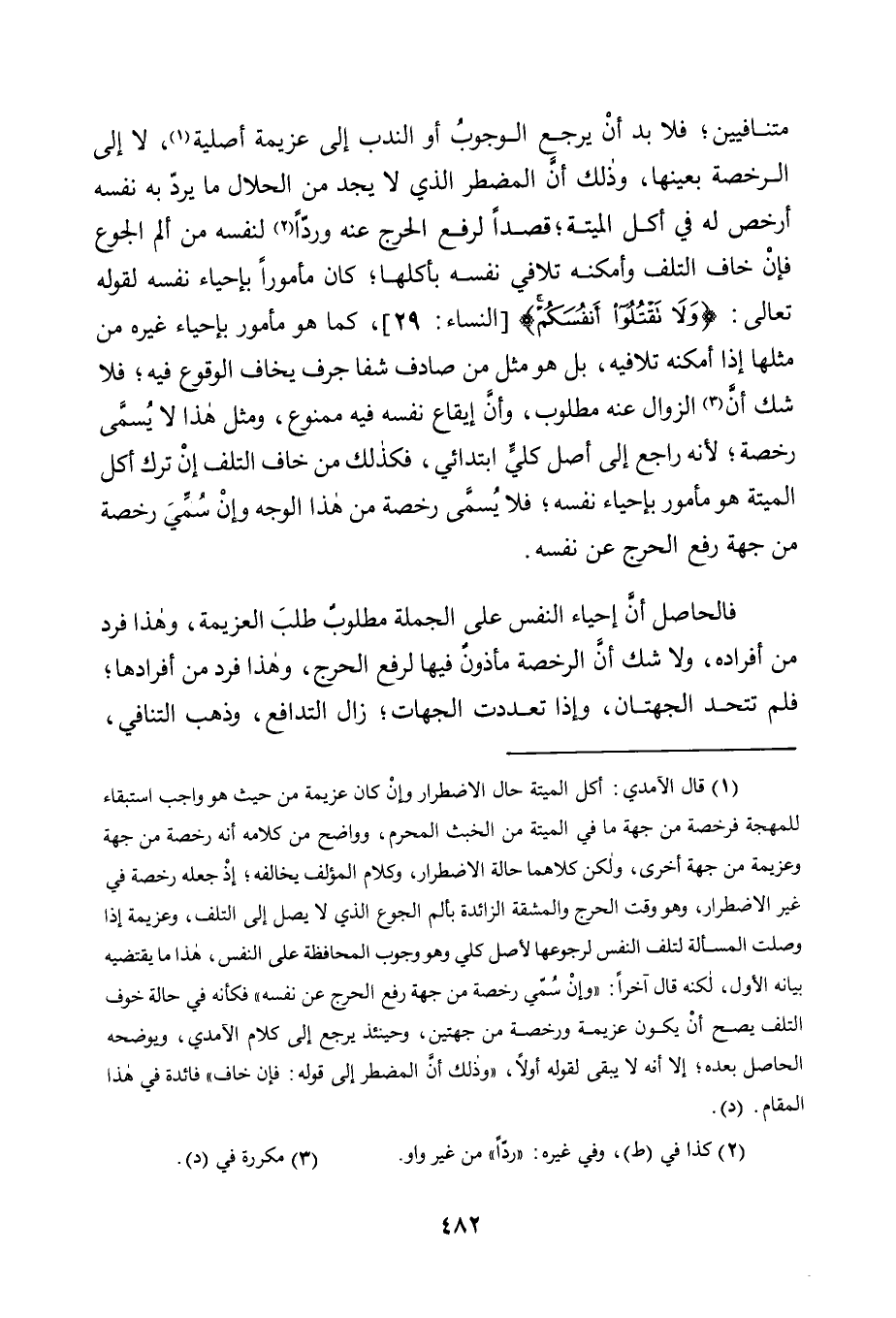 فَالْحَاصِلُ أَنَّ إِحْيَاءَ النَّفْسِ عَلَى الْجُمْلَةِ مَطْلُوبٌ طَلَبَ الْعَزِيمَةِ، وَهَذَا فَرْدٌ مِنْ أَفْرَادِهِ، وَلَا شَكَّ أَنَّ الرُّخْصَةَ مَأْذُونٌ فِيهَا لِرَفْعِ الْحَرَجِ، وَهَذَا فَرْدٌ مِنْ أَفْرَادِهَا؛ فَلَمْ تَتَّحِدِ الْجِهَتَانِ، وَإِذَا تعددت الجهات؛ زال التدافع، وذهب التنافي،