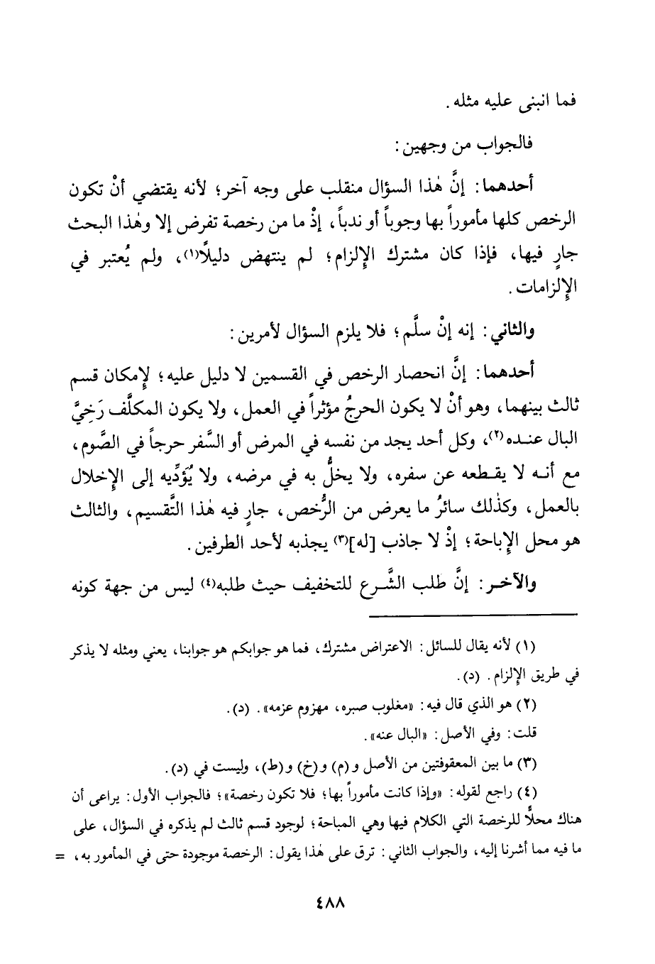 أَنَّ هَذَا السُّؤَالَ مُنْقَلِبٌ عَلَى وَجْهٍ آخَرَ؛ لِأَنَّهُ يَقْتَضِي أَنْ تَكُونَ الرُّخَصُ كُلُّهَا مَأْمُورًا بِهَا وُجُوبًا أَوْ نَدْبًا، إِذْ مَا مِنْ رُخْصَةٍ تُفْرَضُ إِلَّا وَهَذَا الْبَحْثُ جارٍ فيها, فإذا كان مشترك الإلزام؛ لم ينتهض دَلِيلًا1، وَلَمْ يُعْتَبَرْ فِي الْإِلْزَامَاتِ.
