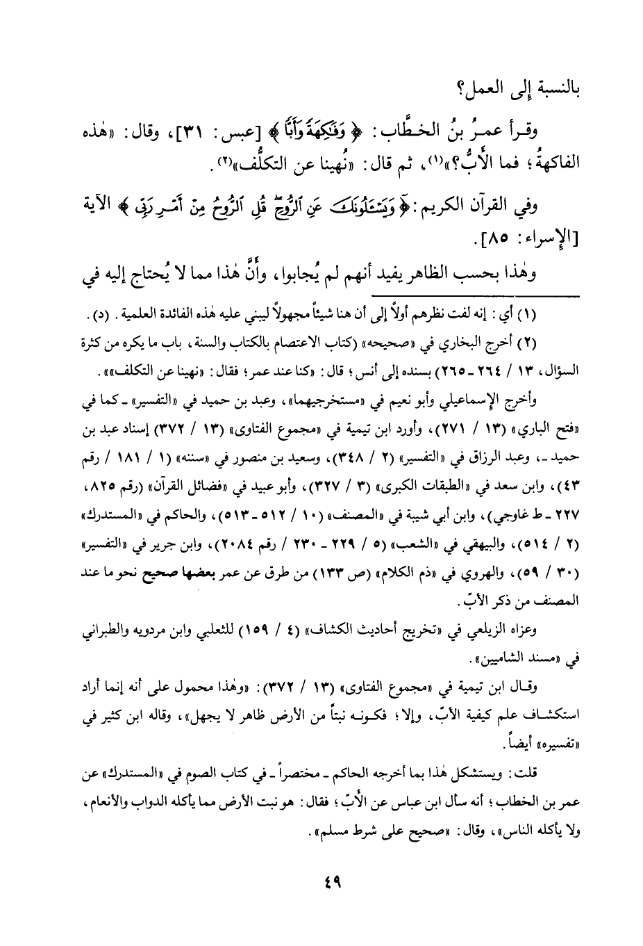 قلت: ويستشكل هذا بما أخرجه الحاكم -مختصرا- في كتاب الصوم في "المستدرك" عن عمر بن الخطاب؛ أنه سأل ابن عباس عن الأب؛ فقال: هو نبت الأرض مما يأكله الدواب والأنعام، ولا يأكله الناس، وقال: "صحيح على شرط مسلم".