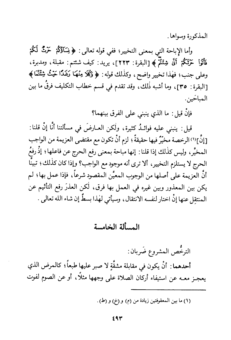 قِيلَ: يَنْبَنِي عَلَيْهِ فَوَائِدُ كَثِيرَةٌ، وَلَكِنَّ العارض في مسألتنا أنا إن قلنا: [إن] 1 الرُّخْصَةُ مُخَيَّرٌ فِيهَا حَقِيقَةً؛ لَزِمَ أَنْ تَكُونَ مَعَ مُقْتَضَى الْعَزِيمَةِ مِنَ الْوَاجِبِ الْمُخَيَّرِ، وَلَيْسَ كَذَلِكَ إِذَا قُلْنَا: إِنَّهَا مُبَاحَةٌ بِمَعْنَى رَفْعِ الْحَرَجِ عَنْ فَاعِلِهَا؛ إِذْ رَفْعُ الْحَرَجِ لَا يَسْتَلْزِمُ التَّخْيِيرَ، أَلَا تَرَى أَنَّهُ مَوْجُودٌ مَعَ الْوَاجِبِ؟ وَإِذَا كَانَ كَذَلِكَ؛ تَبَيَّنَّا أَنَّ الْعَزِيمَةَ عَلَى أَصْلِهَا مِنَ الْوُجُوبِ الْمُعَيَّنِ الْمَقْصُودِ شَرْعًا، فَإِذَا عَمِلَ بِهَا؛ لَمْ يَكُنْ بَيْنَ الْمَعْذُورِ وَبَيْنَ غَيْرِهِ فِي الْعَمَلِ بِهَا فَرْقٌ، لَكِنَّ الْعُذْرَ رَفَعَ التَّأْثِيمَ عَنِ الْمُنْتَقِلِ عَنْهَا إِنِ اخْتَارَ لِنَفْسِهِ الِانْتِقَالَ، وَسَيَأْتِي لِهَذَا بَسْطٌ إِنْ شَاءَ اللَّهُ تَعَالَى.