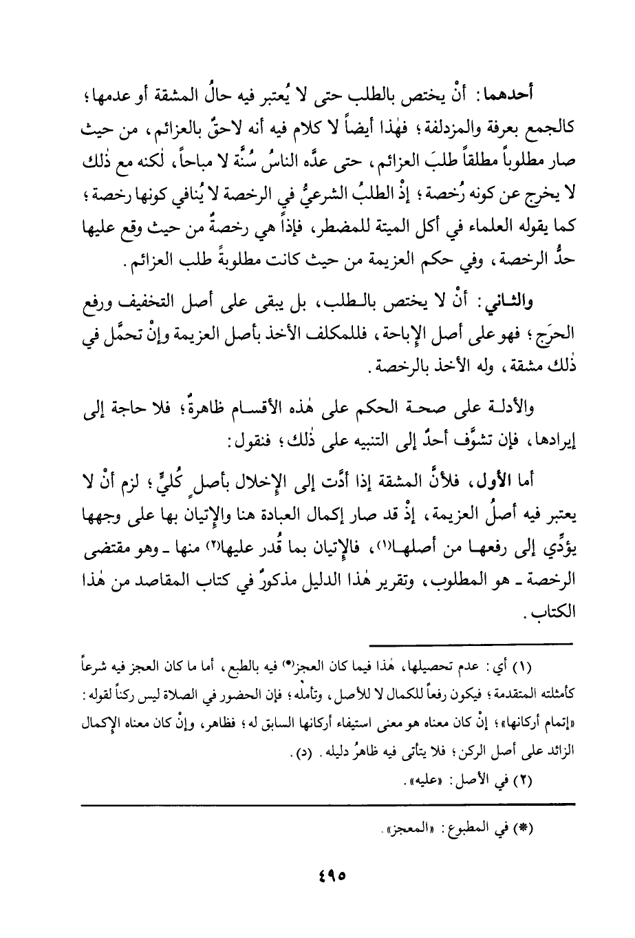 أَنْ يَخْتَصَّ بِالطَّلَبِ حَتَّى لَا يُعْتَبَرَ فِيهِ حَالُ الْمَشَقَّةِ أَوْ عَدَمُهَا؛ كَالْجَمْعِ بِعَرَفَةَ وَالْمُزْدَلِفَةِ؛ فَهَذَا أَيْضًا لَا كَلَامَ فِيهِ أَنَّهُ لَاحِقٌ بِالْعَزَائِمِ، مِنْ حَيْثُ صَارَ مَطْلُوبًا مُطْلَقًا طَلَبَ الْعَزَائِمِ، حَتَّى عَدَّهُ النَّاسُ سُنَّةً لَا مُبَاحًا، لَكِنَّهُ مَعَ ذَلِكَ لَا يَخْرُجُ عَنْ كَوْنِهِ رُخْصَةً؛ إِذِ الطَّلَبُ الشَّرْعِيُّ فِي الرُّخْصَةِ لَا يُنَافِي كَوْنَهَا رُخْصَةً؛ كَمَا يَقُولُهُ الْعُلَمَاءُ فِي أَكْلِ الْمَيْتَةِ لِلْمُضْطَرِّ، فَإِذَا هِيَ رُخْصَةٌ مِنْ حَيْثُ وَقَعَ عَلَيْهَا حَدُّ الرُّخْصَةِ، وَفِي حُكْمِ الْعَزِيمَةِ مِنْ حَيْثُ كَانَتْ مَطْلُوبَةً طَلَبَ الْعَزَائِمِ.