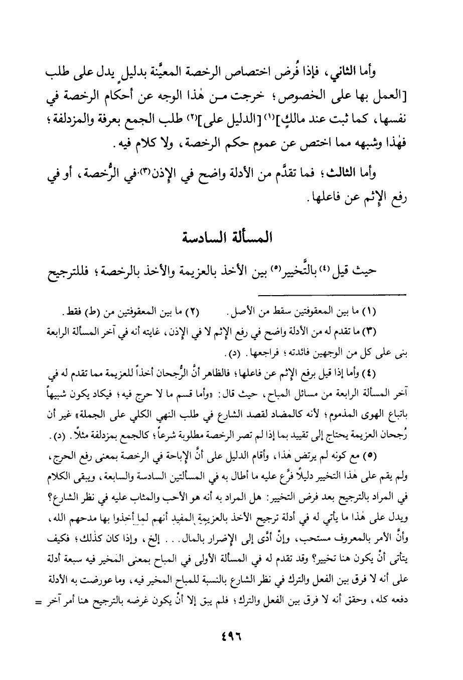 5 مع كونه لم يرتض هذا، وأقام الدليل على أن الإباحة في الرخصة بمعنى رفع الحرج، ولم يقم على هذا التخيير دليلا فرع عليه ما أطال به في المسألتين السادسة والسابعة، ويبقى الكلام في المراد بالترجيح بعد فرض التخيير: هل المراد به أنه هو الأحب والمثاب عليه في نظر الشارع؟ ويدل على هذا ما يأتي له في أدلة ترجيح الأخذ بالعزيمة المفيد أنهم لما أخذوا بها مدحهم الله، وأن الأمر بالمعروف مستحب، وإن أدى إلى الإضرار بالمال ... إلخ، وإذا كان كذلك؛ فكيف يتأتى أن يكون هنا تخيير؟ وقد تقدم له في المسألة الأولى في المباح بمعنى المخير فيه سبعة أدلة على أنه لا فرق بين الفعل والترك في نظر الشارع بالنسبة للمباح المخير فيه، وما عورضت به الأدلة دفعه كله، وحقق أنه لا فرق بين الفعل والترك؛ فلم يبق إلا أن يكون غرضه بالترجيح هنا أمرا آخر =