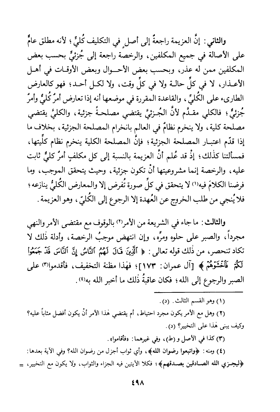 إِنَّ الْعَزِيمَةَ رَاجِعَةٌ إِلَى أَصْلٍ فِي التَّكْلِيفِ كُلِّيٍّ؛ لِأَنَّهُ مُطْلَقٌ عَامٌّ عَلَى الْأَصَالَةِ فِي جَمِيعِ الْمُكَلَّفِينَ، وَالرُّخْصَةُ رَاجِعَةٌ إِلَى جُزْئِيٍّ بِحَسَبِ بَعْضِ الْمُكَلَّفِينَ مِمَّنْ لَهُ عُذْرٌ، وَبِحَسَبِ بَعْضِ الْأَحْوَالِ وَبَعْضِ الْأَوْقَاتِ فِي أَهْلِ الْأَعْذَارِ، لَا فِي كُلِّ حَالَةٍ وَلَا فِي كُلِّ وَقْتٍ، وَلَا لِكُلِّ أَحَدٍ؛ فَهُوَ كَالْعَارِضِ الطَّارِئِ عَلَى الْكُلِّيِّ، وَالْقَاعِدَةُ الْمُقَرَّرَةُ فِي مَوْضِعِهَا أَنَّهُ إِذَا تَعَارَضَ أَمْرٌ كُلِّيٌّ وَأَمْرٌ جُزْئِيٌّ؛ فَالْكُلِّيُّ مُقَدَّمٌ؛ لِأَنَّ الْجُزْئِيَّ يَقْتَضِي مَصْلَحَةً جُزْئِيَّةً، وَالْكُلِّيَّ يَقْتَضِي مَصْلَحَةً كُلِّيَّةً، وَلَا يَنْخَرِمُ نِظَامٌ فِي الْعَالَمِ بِانْخِرَامِ الْمَصْلَحَةِ الْجُزْئِيَّةِ بِخِلَافِ مَا إِذَا قُدِّمَ اعْتِبَارُ الْمَصْلَحَةِ الْجُزْئِيَّةِ؛ فَإِنَّ الْمَصْلَحَةَ الْكُلِّيَّةَ يَنْخَرِمُ نِظَامُ كُلِّيَّتِهَا، فَمَسْأَلَتُنَا كَذَلِكَ؛ إِذْ قَدْ عُلِمَ أَنَّ الْعَزِيمَةَ بِالنِّسْبَةِ إِلَى كُلِّ مُكَلَّفٍ أَمْرٌ كُلِّيٌّ ثَابِتٌ عَلَيْهِ، وَالرُّخْصَةُ إِنَّمَا مَشْرُوعِيَّتُهَا أَنْ تَكُونَ جُزْئِيَّةً، وَحَيْثُ يَتَحَقَّقُ الْمُوجَبُ، وَمَا فَرَضْنَا الْكَلَامَ فِيهِ1 لَا يَتَحَقَّقُ فِي كُلِّ صُورَةٍ تُفْرَضُ إِلَّا وَالْمُعَارِضُ الْكُلِّيُّ يُنَازِعُهُ؛ فَلَا يُنْجِي مِنْ طَلَبِ الْخُرُوجِ عَنِ الْعُهْدَةِ إِلَّا الرُّجُوعُ إلى الكلي، وهو العزيمة.