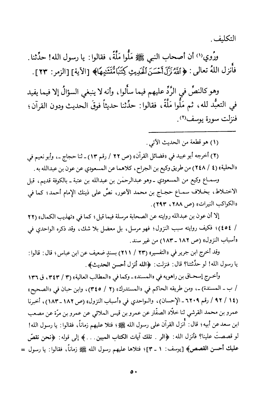 وَهُوَ كَالنَّصِّ فِي الرَّدِّ عَلَيْهِمْ فِيمَا سَأَلُوا، وَأَنَّهُ لَا يَنْبَغِي السُّؤَالُ إِلَّا فِيمَا يُفِيدُ فِي التَّعَبُّدِ لِلَّهِ، ثُمَّ ملُّوا ملَّة، فَقَالُوا: حدِّثنا حَدِيثًا فَوْقَ الْحَدِيثِ وَدُونَ الْقُرْآنِ؛ فَنَزَلَتْ سُورَةُ يُوسُفَ2.