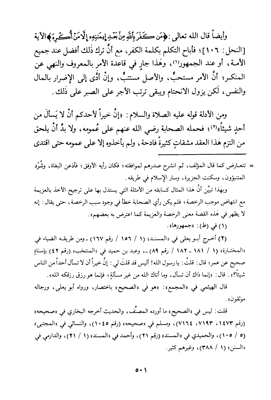 وَأَيْضًا قَالَ اللَّهُ تَعَالَى: {مَنْ كَفَرَ بِاللَّهِ مِنْ بَعْدِ إِيمَانِهِ إِلَّا مَنْ أُكْرِهَ} الْآيَةَ [النَّحْلِ: 106] ؛ فَأَبَاحَ التَّكَلُّمَ بِكَلِمَةِ الْكُفْرِ، مَعَ أَنَّ تَرْكَ ذَلِكَ أَفْضَلُ عِنْدَ جَمِيعِ الْأُمَّةِ، أَوْ عِنْدَ الْجُمْهُورِ1، وَهَذَا جارٍ فِي قَاعِدَةِ الْأَمْرِ بِالْمَعْرُوفِ وَالنَّهْيِ عَنِ الْمُنْكَرِ؛ أَنَّ الْأَمْرَ مُسْتَحَبٌّ، وَالْأَصْلَ مُسْتَتِبٌّ، وَإِنْ أَدَّى إِلَى الْإِضْرَارِ بِالْمَالِ وَالنَّفْسِ، لَكِنْ يَزُولُ الِانْحِتَامُ وَيَبْقَى تَرَتُّبُ الْأَجْرِ عَلَى الصَّبْرِ عَلَى ذَلِكَ.