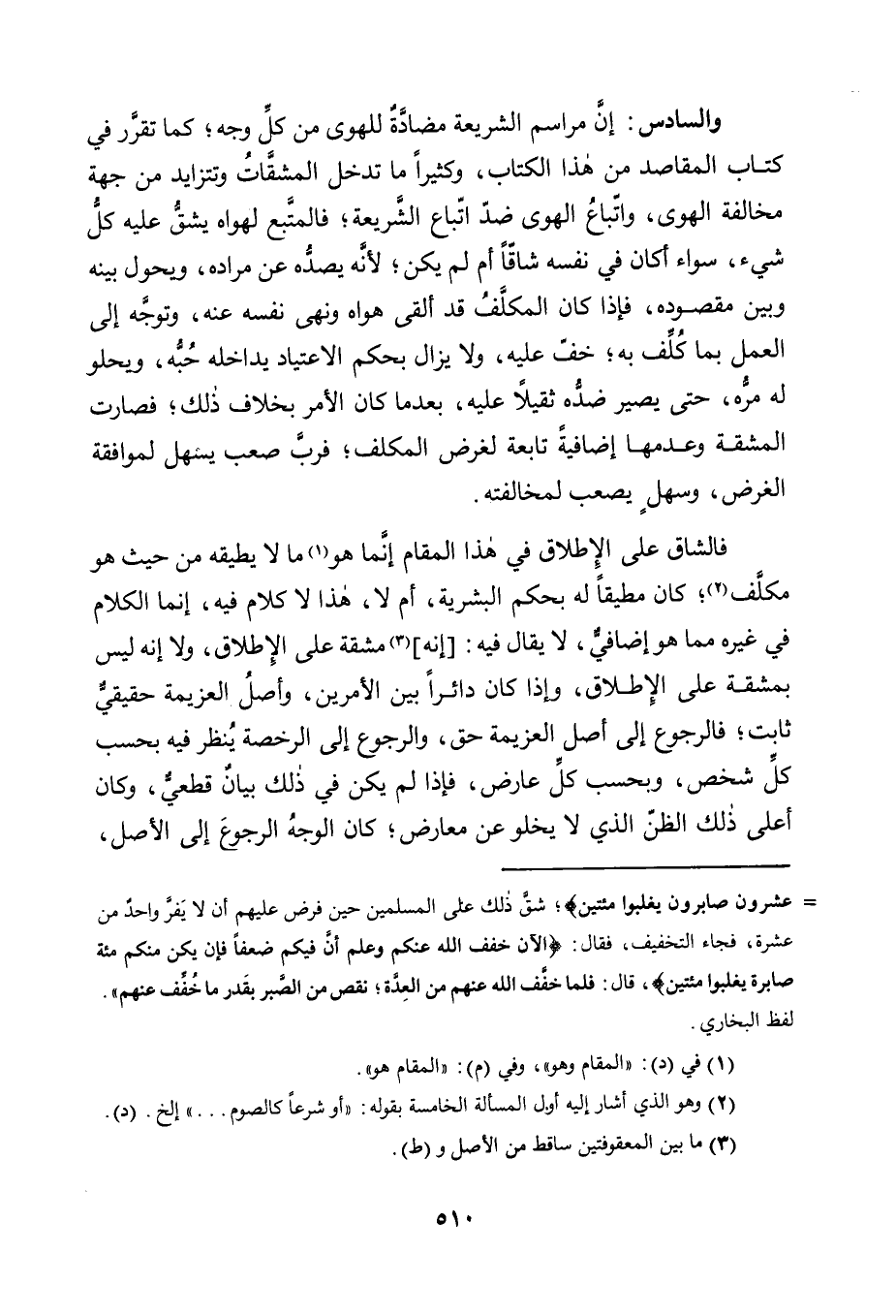إِنَّ مَرَاسِمَ الشَّرِيعَةِ مُضَادَّةٌ لِلْهَوَى مِنْ كُلِّ وَجْهٍ؛ كَمَا تَقَرَّرَ فِي كِتَابِ الْمَقَاصِدِ مِنْ هَذَا الْكِتَابِ، وَكَثِيرًا مَا تَدْخُلُ الْمَشَقَّاتُ وَتَتَزَايَدُ مِنْ جِهَةِ مُخَالِفَةِ الْهَوَى، وَاتِّبَاعُ الْهَوَى ضِدُّ اتِّبَاعِ الشَّرِيعَةِ؛ فَالْمُتَّبِعُ لِهَوَاهُ يَشُقُّ عَلَيْهِ كُلُّ شَيْءٍ، سَوَاءٌ أَكَانَ فِي نَفْسِهِ شَاقًّا أَمْ لَمْ يَكُنْ؛ لِأَنَّهُ يَصُدُّهُ عَنْ مُرَادِهِ، وَيَحُولُ بَيْنَهُ وَبَيْنَ مَقْصُودِهِ، فَإِذَا كَانَ الْمُكَلَّفُ قَدْ أَلْقَى هَوَاهُ وَنَهَى نَفْسَهُ عَنْهُ، وَتَوَجَّهَ إِلَى الْعَمَلِ بِمَا كُلِّفَ بِهِ؛ خَفَّ عَلَيْهِ، وَلَا يَزَالُ بِحُكْمِ الِاعْتِيَادِ يُدَاخِلُهُ حُبُّهُ، وَيَحْلُو لَهُ مُرُّهُ، حَتَّى يَصِيرَ ضِدَّهُ ثَقِيلًا عَلَيْهِ، بعدما كَانَ الْأَمْرُ بِخِلَافِ ذَلِكَ؛ فَصَارَتِ الْمَشَقَّةُ وَعَدَمُهَا إِضَافِيَّةً تَابِعَةً لِغَرَضِ الْمُكَلَّفِ؛ فَرُبَّ صَعْبٍ يَسْهُلُ لِمُوَافِقَةِ الْغَرَضِ، وَسَهْلٍ يَصْعُبُ لِمُخَالَفَتِهِ.