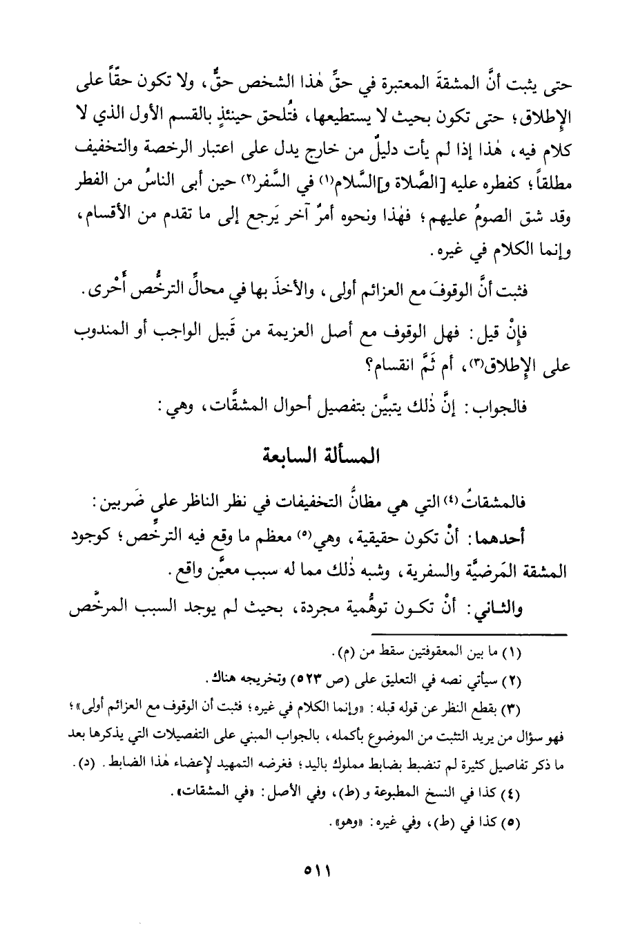 3 بقطع النظر عن قوله قبله: "وَإِنَّمَا الْكَلَامُ فِي غَيْرِهِ؛ فَثَبَتَ أَنَّ الْوُقُوفَ مع العزائم أولى"؛ فهو سؤال من يريد التثبت من الموضوع بأكمله، بالجواب المبني على التفصيلات التي يذكرها بعد ما ذكر تفاصيل كثيرة لم تنضبط بضابط مملوك باليد؛ فغرضه التمهيد لإعضاء هذا الضابط. "د".