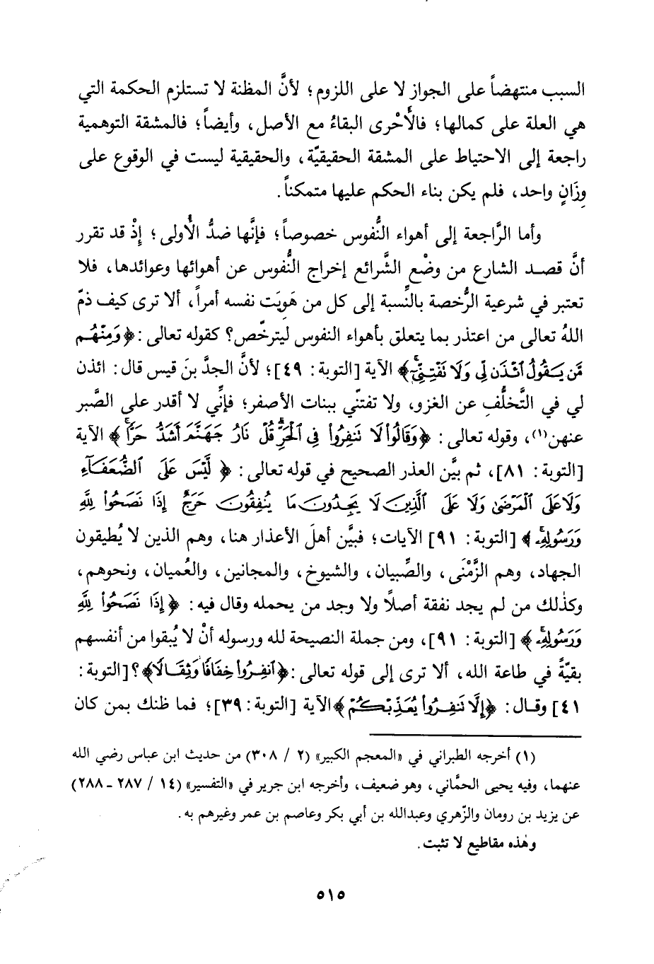 وَأَمَّا الرَّاجِعَةُ إِلَى أَهْوَاءِ النُّفُوسِ خُصُوصًا؛ فَإِنَّهَا ضِدُّ الْأُولَى؛ إِذْ قَدْ تَقَرَّرَ أَنَّ قَصْدَ الشَّارِعِ مِنْ وَضْعِ الشَّرَائِعِ إِخْرَاجُ النُّفُوسِ عَنْ أَهْوَائِهَا وَعَوَائِدِهَا، فَلَا تُعْتَبَرُ فِي شَرْعِيَّةِ الرُّخْصَةِ بِالنِّسْبَةِ إِلَى كُلِّ مَنْ هَوِيَتْ نَفْسُهُ أَمْرًا، أَلَا تَرَى كَيْفَ ذَمَّ اللَّهُ تَعَالَى مَنِ اعْتَذَرَ بِمَا يَتَعَلَّقُ بِأَهْوَاءِ النُّفُوسِ لِيَتَرَخَّصَ؟ كَقَوْلِهِ تَعَالَى: {وَمِنْهُمْ مَنْ يَقُولُ ائْذَنْ لِي وَلا تَفْتِنِّي} الْآيَةَ [التَّوْبَةِ: 49] ؛ لِأَنَّ الْجَدَّ بْنَ قَيْسٍ قَالَ: ائْذَنْ لِي فِي التَّخَلُّفِ عَنِ الْغَزْوِ، وَلَا تَفْتِنِّي بِبَنَاتِ الْأَصْفَرِ؛ فَإِنِّي لَا أَقْدِرُ عَلَى الصَّبْرِ عَنْهُنَّ1، وَقَوْلِهِ تَعَالَى: {وَقَالُوا لَا تَنْفِرُوا فِي الْحَرِّ قُلْ نَارُ جَهَنَّمَ أَشَدُّ حَرًّا} الْآيَةَ [التَّوْبَةِ: 81] ، ثُمَّ بَيَّنَ الْعُذْرَ الصَّحِيحَ فِي قَوْلِهِ تَعَالَى: {لَيْسَ عَلَى الضُّعَفَاءِ وَلا عَلَى الْمَرْضَى وَلا عَلَى الَّذِينَ لَا يَجِدُونَ مَا يُنْفِقُونَ حَرَجٌ إِذَا نَصَحُوا لِلَّهِ وَرَسُولِهِ} [التوبة: 91] الآيات؛ فَبَيَّنَ أَهْلَ الْأَعْذَارِ هُنَا، وَهُمُ الَّذِينَ لَا يُطِيقُونَ الْجِهَادَ، وَهُمُ الزَّمْنى، وَالصِّبْيَانُ، وَالشُّيُوخُ، وَالْمَجَانِينُ، وَالْعُمْيَانُ، وَنَحْوُهُمْ، وَكَذَلِكَ مَنْ لَمْ يَجِدْ نَفَقَةً أَصْلًا, وَلَا وَجَدَ مَنْ يَحْمِلُهُ وَقَالَ فِيهِ: {إِذَا نَصَحُوا لِلَّهِ وَرَسُولِهِ} [التوبة: 91] ، وَمِنْ جُمْلَةِ النَّصِيحَةِ لِلَّهِ وَرَسُولِهِ أَنْ لَا يُبْقُوا مِنْ أَنْفُسِهِمْ بَقِيَّةً فِي طَاعَةِ اللَّهِ، أَلَا تَرَى إِلَى قَوْلِهِ تَعَالَى: {انْفِرُوا خِفَافًا وَثِقَالًا} ؟ [التَّوْبَةِ: 41] وَقَالَ: {إِلاّ تَنْفِرُوا يُعَذِّبْكُمْ} الْآيَةَ [التوبة: 39] ؛ فما ظنك بمن كان