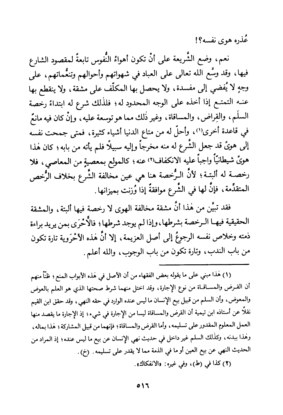 فَقَدْ تَبَيَّنَ مِنْ هَذَا أَنَّ مَشَقَّةَ مُخَالَفَةِ الْهَوَى لَا رُخْصَةَ فِيهَا أَلْبَتَّةَ، وَالْمَشَقَّةُ الْحَقِيقِيَّةُ فِيهَا الرُّخْصَةُ بِشَرْطِهَا، وَإِذَا لَمْ يُوجَدْ شَرْطُهَا؛ فَالْأَحْرَى بِمَنْ يُرِيدُ بَرَاءَةَ ذِمَّتِهِ وَخَلَاصَ نَفْسِهِ الرُّجُوعُ إِلَى أَصْلِ الْعَزِيمَةِ، إِلَّا أَنَّ هَذِهِ الْأَحْرَوِيَّةَ تَارَةً تَكُونُ مِنْ بَابِ النَّدْبِ، وَتَارَةً تَكُونُ من باب الوجوب، والله أعلم.