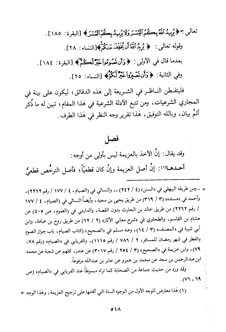 1 هذا معارض للوجه الأول من الوجوه الستة التي أقامها على ترجيح العزيمة، وهذا الوجه لا يفيد ترجح الرخصة، إنما يفيد -كما قال- أن العزيمة ليست بأولى؛ لأن غلبة الظن في وجود سبب الرخصة لا تجامع القطع في العزيمة الذي كان مناط الترجيح في ذلك الوجه. "د".