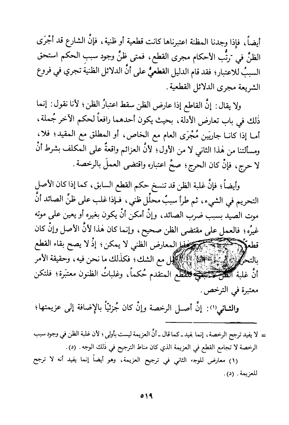 وَلَا يُقَالُ: إِنَّ الْقَاطِعَ إِذَا عَارَضَ الظَّنَّ سَقَطَ اعْتِبَارُ الظَّنِّ؛ لِأَنَّا نَقُولُ: إِنَّمَا ذَلِكَ فِي بَابِ تَعَارُضِ الْأَدِلَّةِ، بِحَيْثُ يَكُونُ أَحَدُهُمَا رَافِعًا لِحُكْمِ الْآخَرِ جُمْلَةً، أَمَّا إِذَا كَانَا جَارِيَيْنِ مَجْرَى الْعَامِّ مَعَ الْخَاصِّ، أَوِ الْمُطْلَقِ مَعَ الْمُقَيَّدِ؛ فَلَا، وَمَسْأَلَتُنَا مِنْ هَذَا الثَّانِي لَا مِنَ الْأَوَّلِ؛ لِأَنَّ الْعَزَائِمَ وَاقِعَةٌ عَلَى الْمُكَلَّفِ بِشَرْطِ أَنْ لَا حَرَجَ، فَإِنْ كَانَ الْحَرَجُ؛ صَحَّ اعْتِبَارُهُ وَاقْتَضَى الْعَمَلَ بِالرُّخْصَةِ.