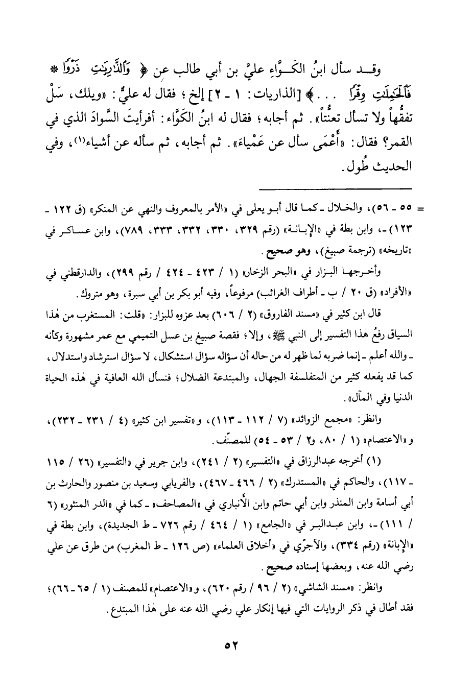 1 أخرجه عبد الرزاق في "التفسير" "2/ 241"، وابن جرير في "التفسير" "26/ 115-117"، والحاكم في "المستدرك" "2/ 466-467"، والفريابي وسعيد بن منصور والحارث بن أبي أسامة وابن المنذر وابن أبي حاتم وابن الأنباري في "المصاحف" -كما في "الدر المنثور" "6/ 111"- وابن عبد البر في "الجامع" "1/ 464/ رقم 726-ط الجديدة"، وابن بطة في "الإبانة" "رقم 334"، والآجري في "أخلاق العلماء" "ص126-ط المغرب" من طرق عن علي -رضي الله عنه- وبعضها إسناده صحيح.