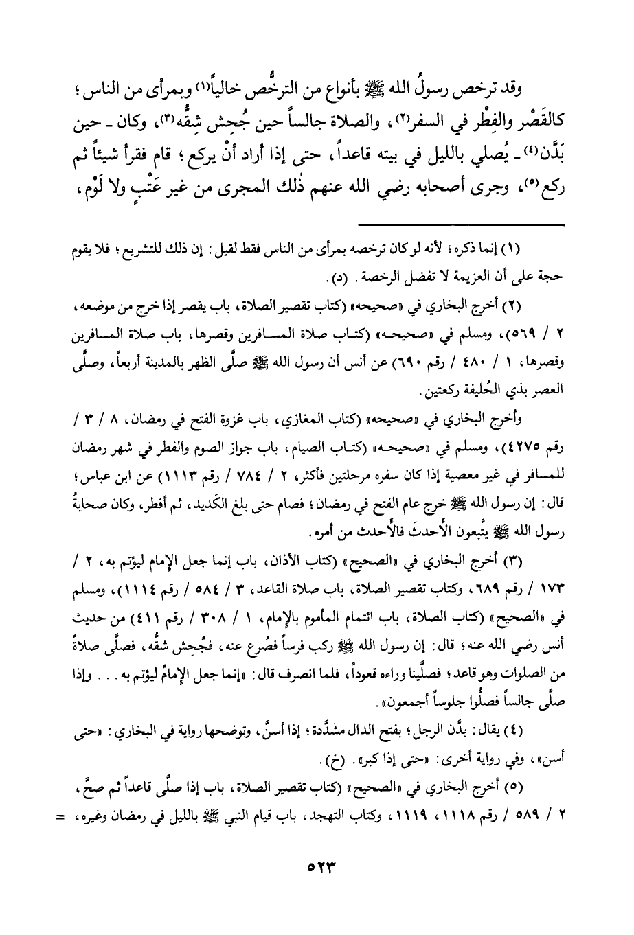 وَقَدْ تَرَخَّصَ رَسُولُ اللَّهِ -صَلَّى اللَّهُ عَلَيْهِ وَسَلَّمَ- بِأَنْوَاعٍ مِنَ التَّرَخُّصِ خَالِيًا1 وَبِمَرْأًى مِنَ النَّاسِ؛ كَالْقَصْرِ وَالْفِطْرِ فِي السَّفَرِ2، وَالصَّلَاةِ جَالِسًا حِينَ جُحِشَ شِقُّه3، وَكَانَ -حِينَ بَدَّنَ4- يُصَلِّي بِاللَّيْلِ فِي بَيْتِهِ قَاعِدًا، حَتَّى إِذَا أَرَادَ أَنْ يَرْكَعَ؛ قَامَ فَقَرَأَ شَيْئًا ثُمَّ رَكَعَ5، وَجَرَى أَصْحَابُهُ -رَضِيَ اللَّهُ عَنْهُمْ- ذَلِكَ الْمَجْرَى من غير عَتْب ولا لوم،