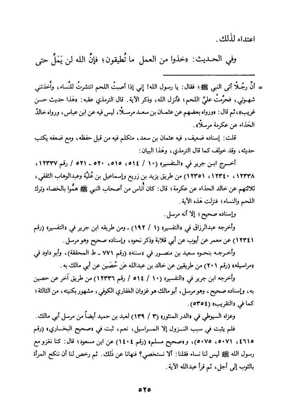 وَفِي الْحَدِيثِ: "خُذُوا مِنَ الْعَمَلِ مَا تُطِيقُونَ؛ فَإِنَّ اللَّهَ لَنْ يَمَلَّ حَتَّى