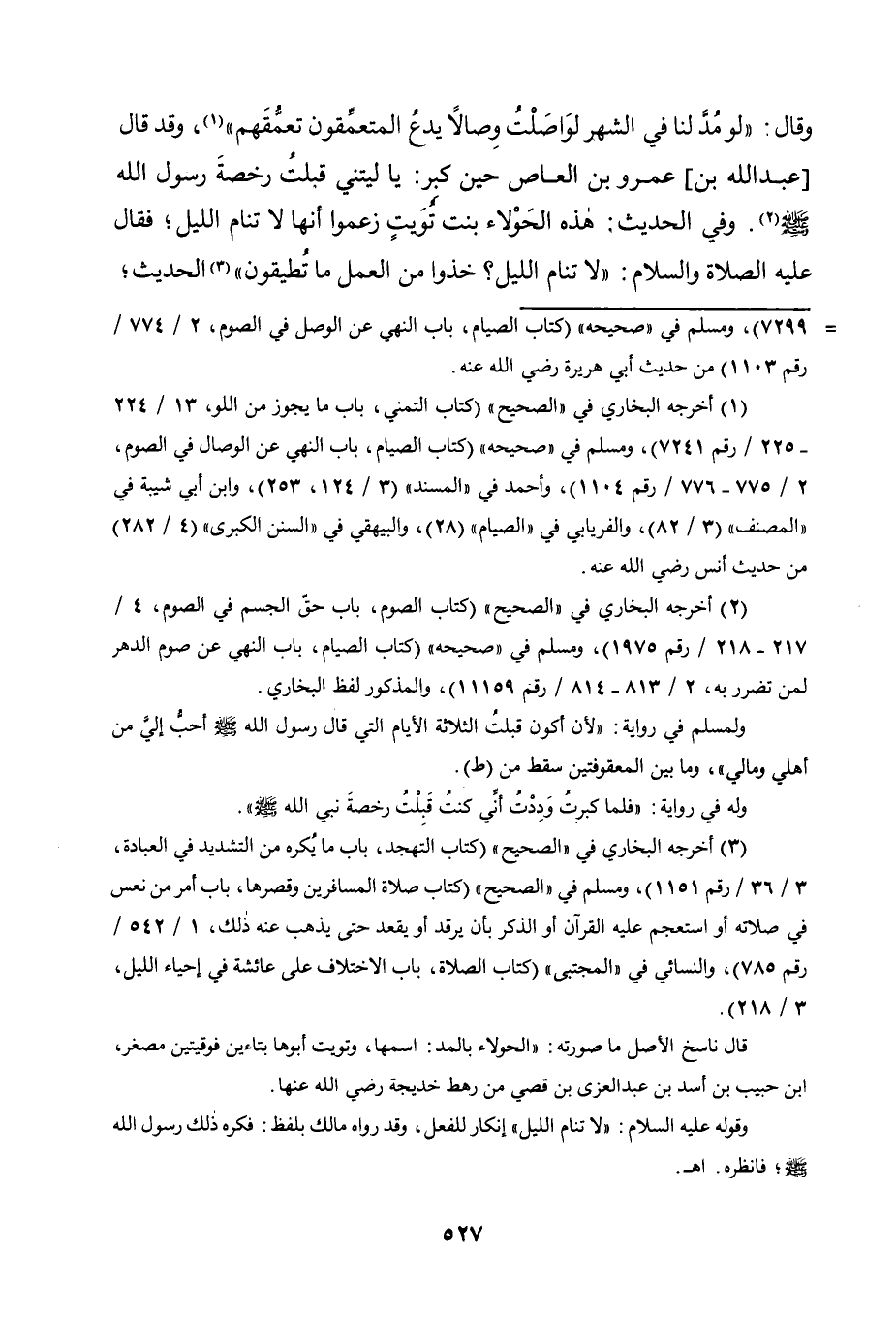 وَقَالَ: "لَوْ مُدَّ لَنَا فِي الشَّهْرِ لَوَاصَلْتُ وِصَالًا يَدَعُ الْمُتَعَمِّقُونَ تَعَمُّقَهُمْ" 1، وَقَدْ قَالَ [عَبْدُ اللَّهِ بْنُ] عَمْرِو بْنِ الْعَاصِ حِينَ كَبِرَ: يَا لَيْتَنِي قَبِلْتُ رُخْصَةَ رَسُولِ اللَّهِ, صَلَّى اللَّهُ عَلَيْهِ وَسَلَّمَ2. وَفِي الْحَدِيثِ: هَذِهِ الْحَوْلَاءُ بِنْتُ تُوَيْتٍ زَعَمُوا أَنَّهَا لَا تَنَامُ اللَّيْلَ؛ فَقَالَ عَلَيْهِ الصَّلَاةُ وَالسَّلَامُ: "لَا تَنَامُ اللَّيْلَ؟ خذوا من العمل ما تطيقون" 3 الحديث؛